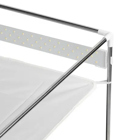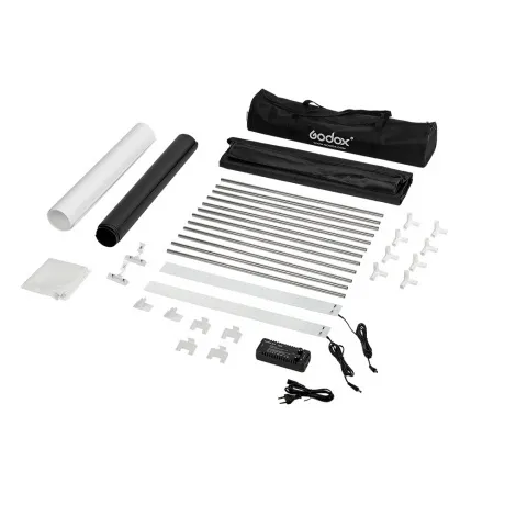 Фотобокс Godox LSD60 с LED подсветкой это готовая мини-студия для фотографирования небольших объектов, внутренний размер фотобокса 60?60?60 см. Используется в предметной съёмке: для печатных каталогов, интернет-магазинов и т. д. Компактность фотобокса в сложенном состоянии позволяет хранить его в любом шкафу. Также фотобокс отличается простотой сборки и разборки, использование инструмента для этого — исключено. Конструкция представляет собой трубчатый каркас с надетым на него кожухом с внутренними серебристыми отражающими поверхностями. На гранях кожуха фотобокса есть три отверстия закрытые клапанами на липучке. Два больших отверстия расположены на передней и верхней гранях фотобокса и предназначены для фотографирования объектов с разных ракурсов. Маленькое отверстие (на верхней грани) предназначено для заведения кабелей питания светодиодных линеек внутрь фотобокса. Фотографирование предметов также можно осуществлять полностью откинув переднюю грань фотобокса. Крепление светодиодных линеек производится за счёт пластиковых клипс (предусмотрены в комплекте) на верхние либо на вертикальные рёбра внутрь фотобокса (для крепления на вертикальные трубки и на горизонтальные предназначены разные клипсы). Для получения более рассеянного света, в комплекте предусмотрен тканевый светорассеиватель, фиксация которого осуществляется за счёт резиновых петель к трубчатому каркасу фотобокса. Для получения более качественного светотеневого рисунка — положение светорассеивателя можно регулировать по высоте. В комплекте предусмотрено два пластиковых полуматовых фона. Цвета фонов: чёрный и белый. Крепление фона к каркасу производится двумя комплектными прищепками. Освещение фотобокса осуществляется двумя мощными светодиодными линейками. С помощью кабеля со штекером, каждая линейка подключается к адаптеру питания Godox LSC2. Раздельная регулировка яркости линеек и их выключение производится за счёт двух диммеров, находящихся на корпусе адаптера питания. Суммарная мощность всех светодиодов составляет 40 Вт. Цветовая температура осветителей — 5800 К ± 200 К. Индекс цветопередачи CRI составляет более 96. Для хранения и транспортировки в комплекте предусмотрена мягкая нейлоновая сумка-чехол на молнии с ручками.