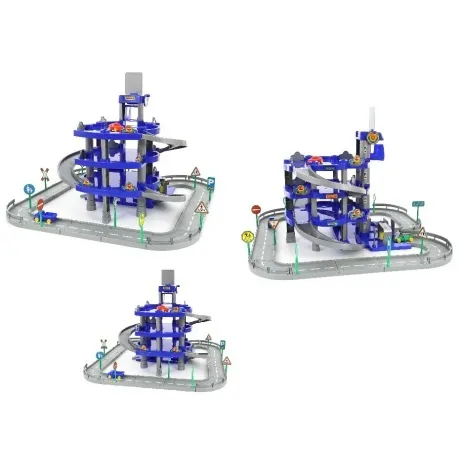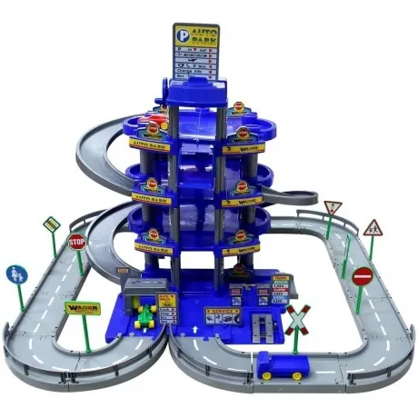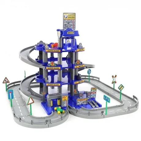 Паркинг представлен элементами для сборки 4-х уровневой парковки с гаражом, автомобильной дорогой с дорожными знаками для увлекательной игры маленьких автолюбителей. Собрать его не составит труда, все детали крупные и прекрасно соединяются. Паркинг имеет 4 уровня, поэтому в него можно поставить много машинок. На первом уровне находится станция техобслуживания и автомойка, что позволит расширить границы сюжетной игры. Перед паркингом находится дорога с разметкой и реалистичными дорожными знаками, которая подойдет для того, чтобы устроить автогонки.