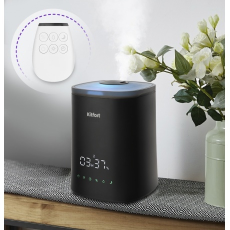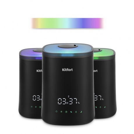Ультразвуковой увлажнитель - ароматизатор воздуха Kitfort KT-2808 увлажняет воздух в помещении (площадью не более 2530 м), создавая хороший микроклимат для проживания людей. В комплекте к увлажнителю идёт пульт дистанционного управления. Залейте чистую холодную воду в резервуар, добавьте прямо в основание увлажнителя 10-20 капель любимого эфирного масла на водной основе. И наслаждайтесь любимым ароматом! В увлажнителе-ароматизаторе можно установить целевую влажность воздуха 30-75 % с шагом 5, время таймера - 2, 4 или 6 часов и интенсивность тумана 1, 2 или 3. А также включить или выключить подсветку в корпусе. Корпус увлажнителя - ароматизатора подсвечивается изнутри разными цветами, его можно использовать в ночное время в качестве ночника. При помощи спокойных приятных цветов создаст в доме уютную атмосферу.