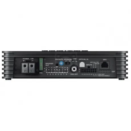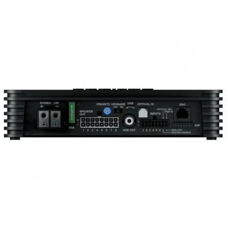 Это чрезвычайно компактный усилитель с 8-ю каналами усиления и встроенным 9-канальным цифровым аудиопроцессором (DSP) для настройки звучания и конфигурации. Но это лишь начало, а полный перечень функций AP8.9 bit открывает принципиально новые возможности в высококачественной автомобильной аудиотехнике. Более того, все они доступны с потрясающим удобством, даже в случае апгрейда развитых и сложных штатных аудиосистем. 3 пары (6 каналов) входных аналоговых разъемов готовы принять как низкоуровневый, так и высокоуровневый аудиосигнал от источника. Входные каналы можно произвольно сконфигурировать в зависимости от особенностей аудиосистемы: это может быть один вход для шести произвольных каналов (например, фронт + тыл + сабвуфер, или фронт bi-amping + тыл), или два разных входа (например, 2 пары для фронт + тыл, и 1 пара для отдельного входа AUX), или входы по схеме 5.1 (фронт + тыл + центральный канал + сабвуфер). Если на вход подается аудиосигнал с предискажениями (прошедший через неотключаемые штатные эквалайзер, кроссовер и т.д.), то он автоматически восстанавливается до полного вида с ровной АЧХ силами встроенного аудиопроцессора. Усилитель оснащен также цифровым оптическим входом TOSLINK, поддерживающим аудиосигнал S/PDIF (стерео) высокого разрешения, до 24 бита / 96 кГц включительно. Любую пару выходных каналов можно включить в мостовом режиме, получив существенную прибавку в мощности. При желании можно подать обработанный аудиопроцессором сигнал сабвуферного канала на внешний усилитель – например, Prima AP1 D. Все усилители Prima, независимо от числа каналов и оснащения, имеют одинаковые габариты 191x131x34 мм и допускают установку друг на друга в едином вертикальном массиве. При этом даже блок из нескольких усилителей остается настолько компактным, что найти ему место в автомобиле не составит никакого труда.