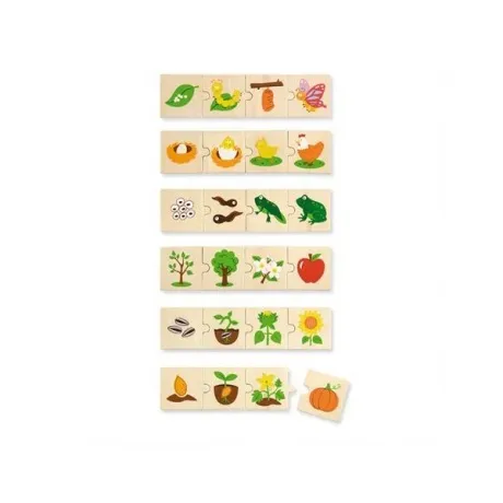 Набор состоит из 24 отдельных элементов с изображением различных фаз развития животных, насекомых и растений. Элементы нужно рассортировать по категориям и собрать в мини-пазлы. Выполняя задание, ребенок развивает мышление, логику, координацию работы рук и глаз, а также получает представление об основах биологии.