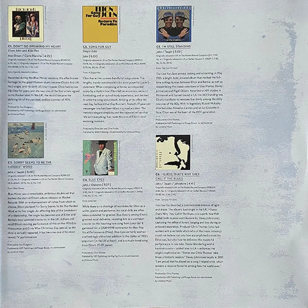 Прекрасное оформление двухдискового сборника, выпущенного в 2017 году к 50-летию сотрудничества певца и композитора Элтона Джона с автором текстов Берни Топином. На тыльной стороне конверта - список песен и высказывания Элтона Джона и Берни Топина о своём сотрудничестве, на развороте - фото Элтона Джона. Диски - ровные, без дефектов. Внутренние конверты - из плотной бумаги, с комментариями к каждому треку и с фотографией альбома или сингла, откуда этот трек взят. Сборник содержит треки, ранее не выходившие на альбомах.