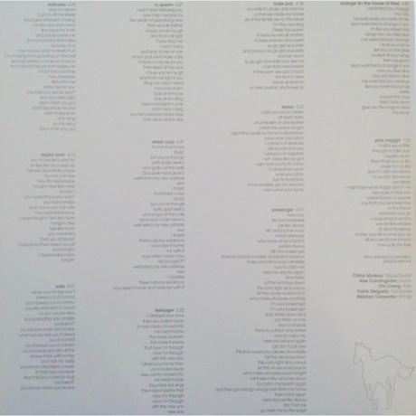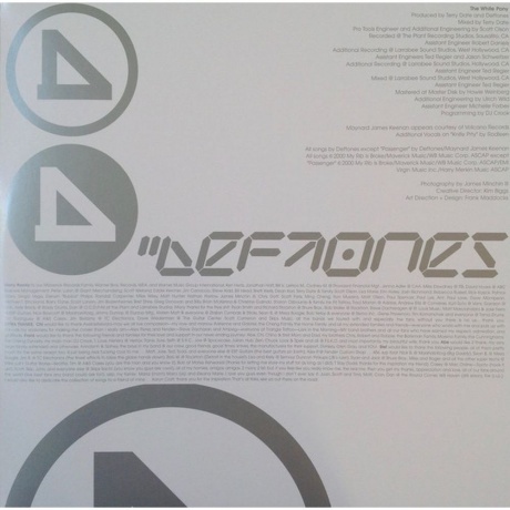Выпущенное в 2010 году, переиздание на виниле третьего студийного альбома американской альтернативной метал-группы Deftones, выпущенного в июне 2000 года и ставшего платиновым спустя два года после выхода. 20 июня 2000 Deftones выпустили альбом White Pony, который стал третьим студийником в дискографии этой американской рок-группы. Лонгплей был настоящим миксом таких жанров, как New Wave, Trip hop, Dream pop и Shoegaze, благодаря чему был отмечен значительный рост команды в музыкальном плане. Пластинка стала первым альбомом для клавишника Франка Дельгадо, где он выступил в роли полноценного участника группы, а не только в качестве гостя. Сама фраза «White Pony» - это уличный сленг, для названия кокаина. Альбом стал самой продолжительной записью в истории Deftones, музыканты, работая над ним, провели в студии четыре месяца. White Pony был номинирован на премию Grammy, где песня «Elite» одержала победу в номинации Best Metal Performance. В американском чарте Billboard 200 студийник поднялся на третье место. Deftones - американская рок-команда, стоявшая у истоков такого музыкального направления как Nu-Metal. Несмотря на то, что группа была создана в 1988 году, контракт срекорд-лейбом был подписан лишь в 1995. Настоящий успех пришел к Deftones после выхода их второго альбома Around the Fu (1997), благодаря хитам из которого «My Own Summer» и «Be Quiet And Drive» команде удалось занять свое место на рок-сцене. Сегодня группа активно гастролирует, а ее дискография насчитывает восемь студийников.