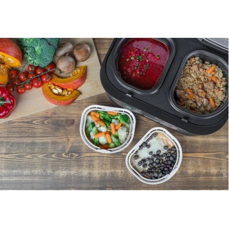 2 поддона для приготовления на пару – наслаждайтесь полезной и вкусной пищей каждый день! Используйте обе чаши и оба поддона и наслаждайтесь полноценным обедом из нескольких блюд, приготовленным быстро и легко!