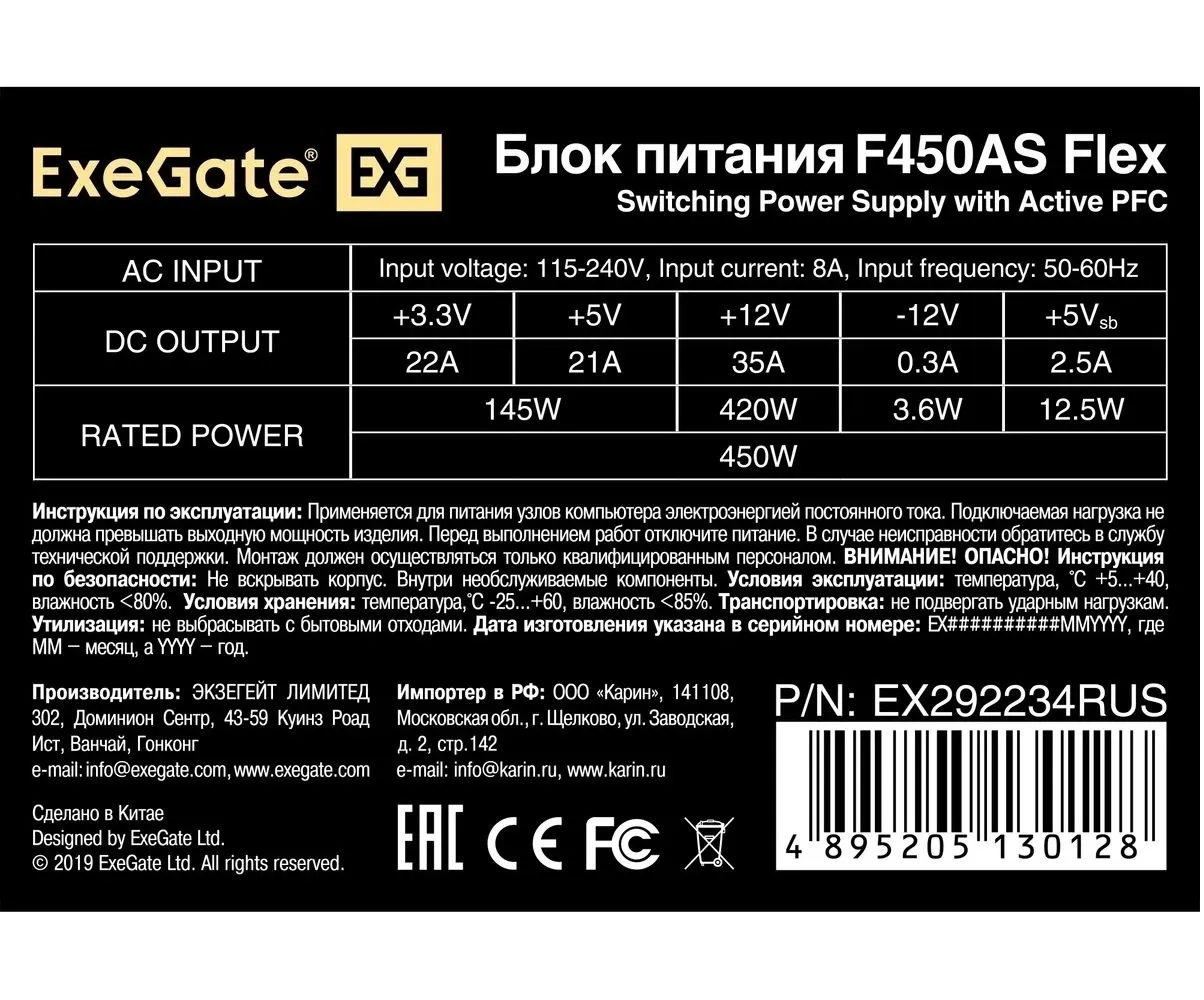 Описание товара Блок питания ExeGate 450W F450AS (EX292234RUS)