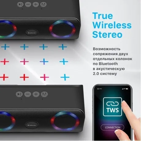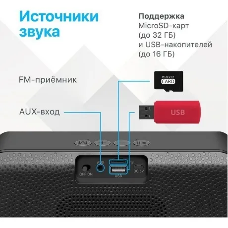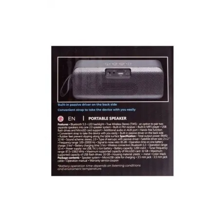 True Wireless Stereo (TWS) — возможность сопряжения двух отдельных колонок по Bluetooth в акустическую 2.0 систему. Встроенный FM-приемник. Встроенный тюнер превращает колонку в полноценный радиоприемник. Вы всегда сможете послушать ваши любимые радиопередачи или музыку. Встроенный MP3-плеер. Используйте как источник звука USB-флеш-накопитель или карту памяти micro SD. Поддержка USB-накопителей и MicroSD-карт. Дополнительный AUX-аудиовход. С помощью AUX-входа и кабеля 3.5-мм джек — 3.5-мм джек колонки можно подключить к компьютеру (плееру, мобильному телефону) и использовать как мощный динамик. Функция Hands free. Отвечайте на звонки и разговаривайте, не подходя к телефону. Встроенный микрофон позволяет общаться через колонку - так, как будто вы говорите по телефону в режиме громкой связи. Удобный подвес для переноски. Встроенный пассивный излучатель на задней панели. Улучшает качество воспроизведения, усиливает басы и глубину звука. Покрытие soft touch. Резиновые ножки предотвращают скольжение по поверхности стола.