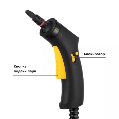 Пароочиститель КТ-9136 предназначен для уборки интерьеров, полов, поверхностей, а также отпаривания тканей. КТ-9136 – многофункциональный аппарат, который может заменить паровую швабру, дезинфектор, стеклоочиститель и отпариватель. Кнопка «Вкл/Выкл» запускает нагрев бойлера и отключает прибор. Индикатор работы загорается после нажатия на кнопку и горит всё время работы прибора. Индикатор готовности пара загорается, когда бойлер нагрелся, и пароочиститель готов к подаче пара. Управление располагается на паровом пистолете. Кнопка подачи пара располагается под пальцем. Чтобы предотвратить случайное нажатие на кнопку подачи пара, на паровом пистолете есть блокиратор.