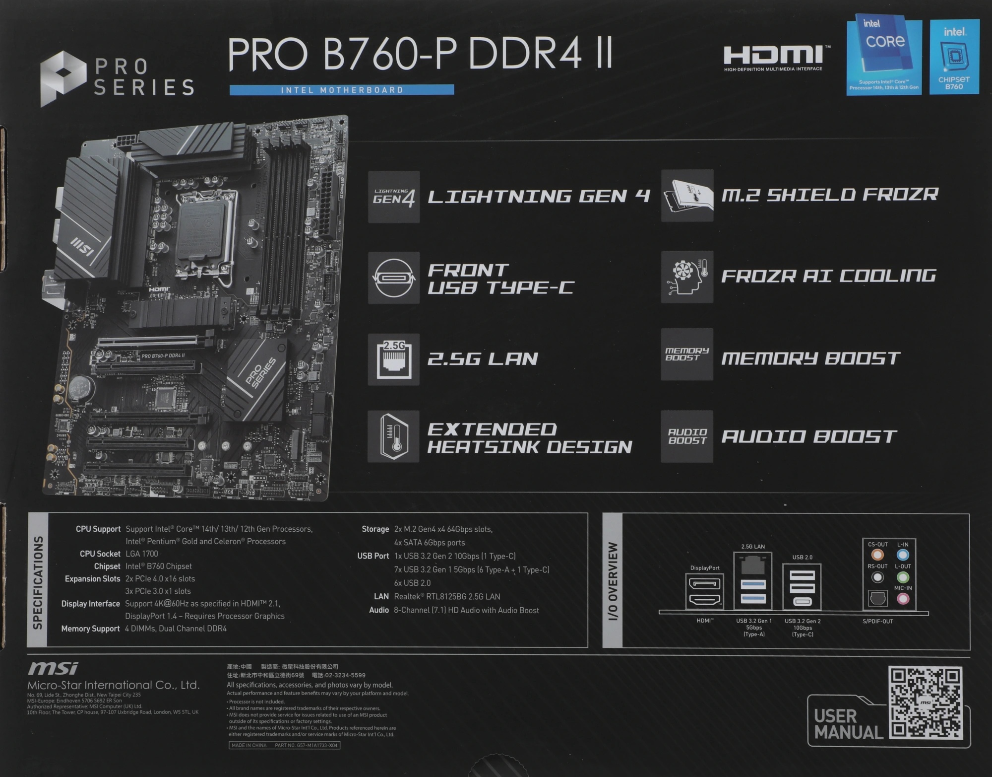 Материнская плата MSI PRO B760-P DDR4 II — функциональная платформа с широкими возможностями конфигурации. Данная модель соответствует формату Standard-ATX, что позволяет легко собрать производительную игровую систему или рабочую станцию. В основе платформы используется чипсет Intel B760 и сокет LGA 1700, что позволяет задействовать различные процессоры. Объем оперативной может достигать 128 ГБ типа DDR4. Для ее монтажа предусмотрено 4 слота DIMM. Локальное файловое хранилище может быть представлено 4 дисками SATA и 2 накопителями M.2.