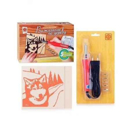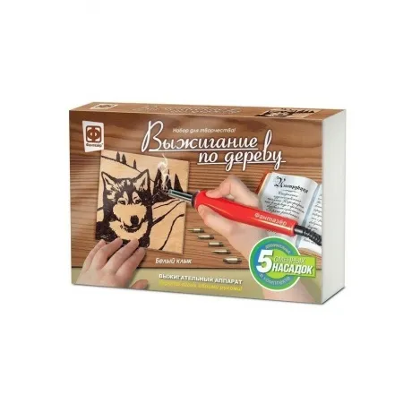Набор для творчества Фантазёр Набор для выжигания Белый клык 371001 способствует развитию творческого потенциала, воспитывает усидчивость и терпение. Набор для выжигания это современный выжигательный аппарат со сменными насадками. Данный набор для творчества развивает мелкую моторику, пространственное мышление, воображение, творческие способности и внимание. С помощью прибора для выжигания, у Вас есть возможность создавать красивые, интересные рисунки на деревянной поверхности. В набор входят две фанерки, одна с нанесенным контуром рисунка (портрет волка на фоне холмов), а вторая пустая, для самостоятельного нанесения рисунка. Вам достаточно будет нанести рисунок на поверхность, выбрать нужную насадку и начать выжигать. Используя различные насадки, наклоняя поверхность под различным углом, можно добиться того, что Ваш рисунок станет более объемным, а тонировка сделает картину более выразительной, подчеркнет фактуру дерева. Готовую картинку можно раскрасить цветными карандашами, фломастерами или акриловыми красками. Покройте готовую работу лаком, он придаст работе законченный вид. (Лак в набор не входит).