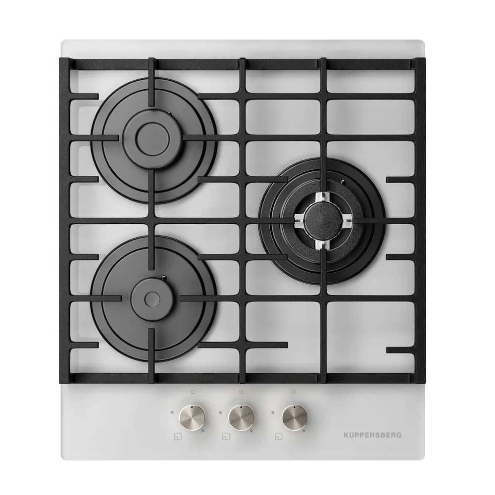 Газовая варочная поверхность Kuppersberg FG 45 W с белой панелью из закаленного стекла имеет три конфорки с чугунными решетками и систему газ-контроля для повышения уровня безопасности. Для управления используются поворотные рычаги со встроенным электроподжигом. Поставляется с запасным набором форсунок.
