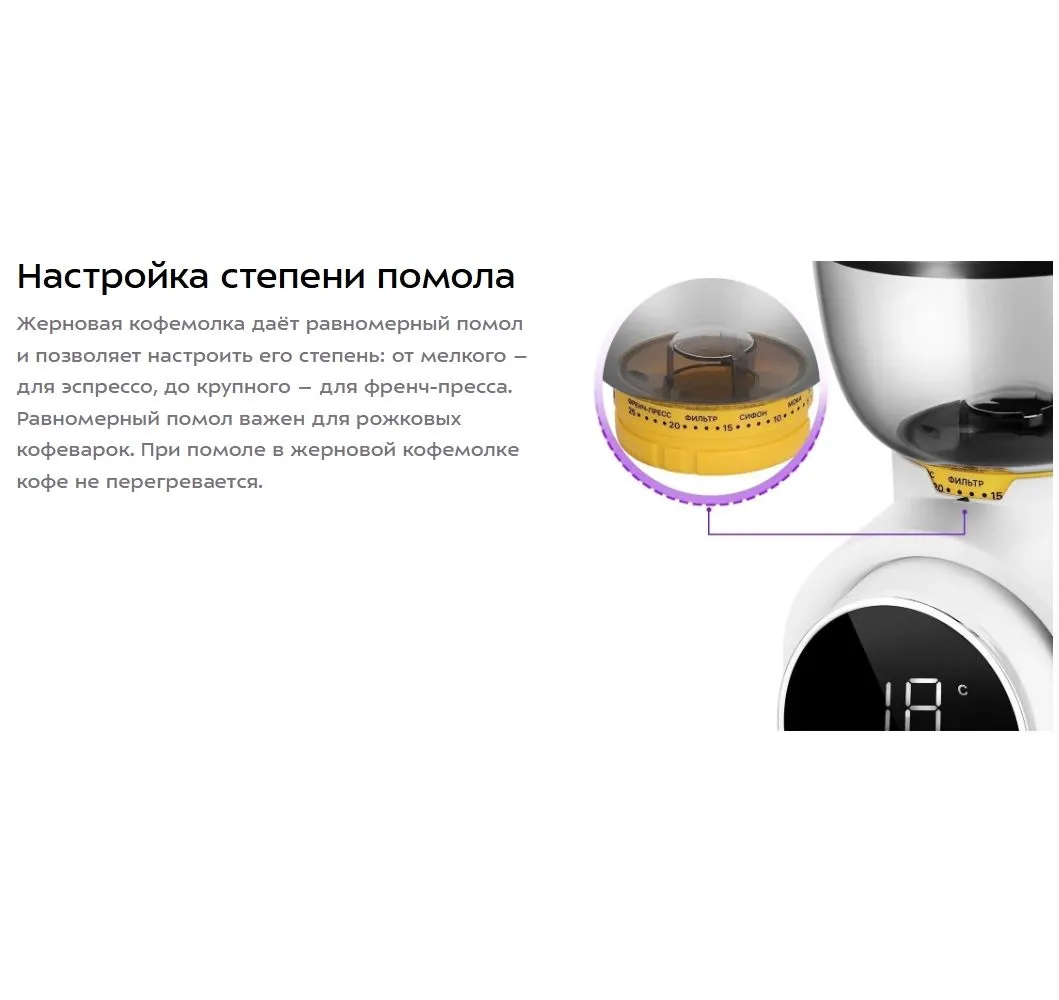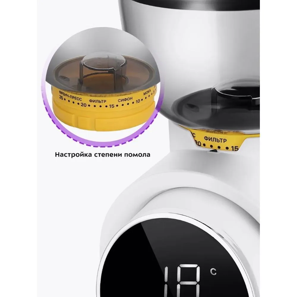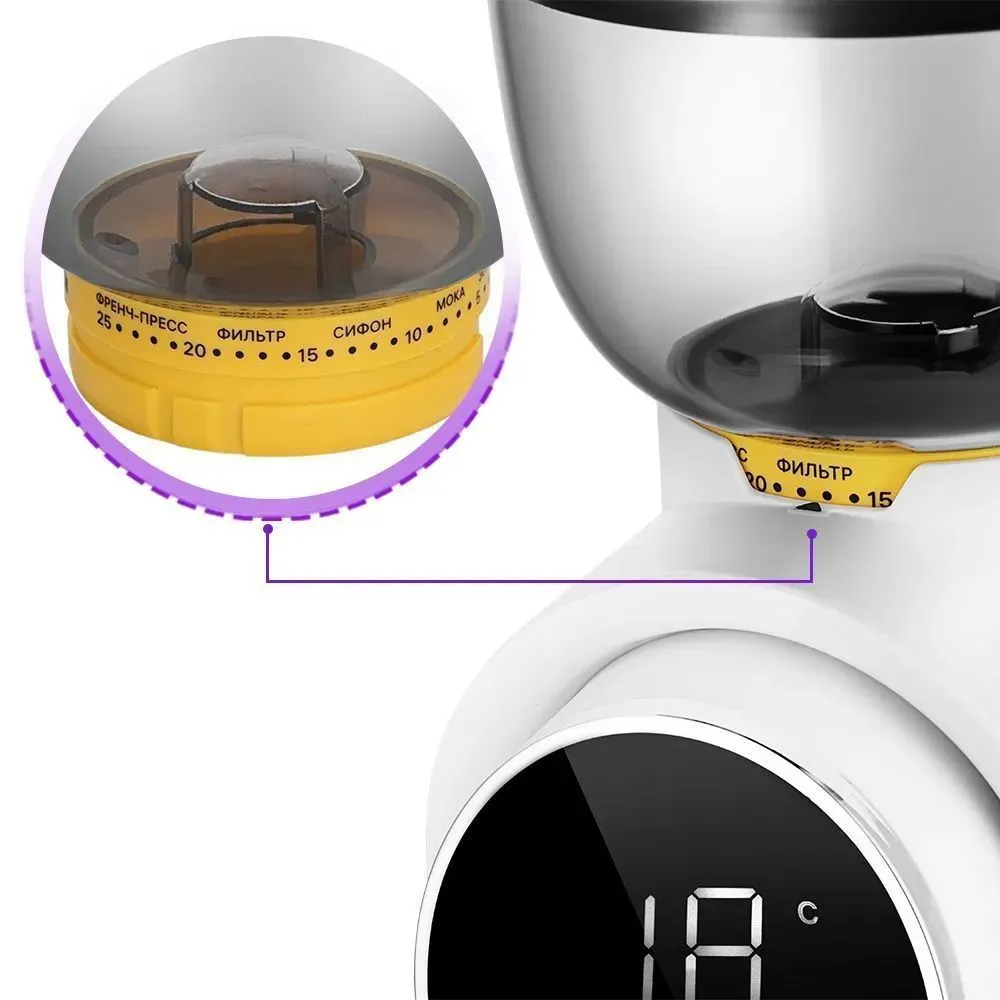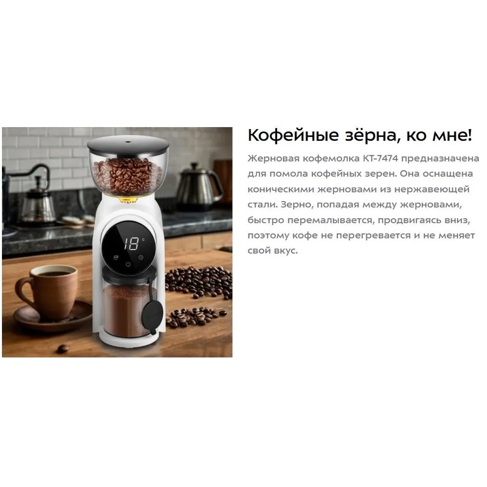 Жерновая кофемолка КТ-7474 предназначена для помола кофейных зерен. Она оснащена коническими жерновами из нержавеющей стали. Зерно, попадая между жерновами, быстро перемалывается, продвигаясь вниз, поэтому кофе не перегревается и не меняет свой вкус. Жерновая кофемолка даёт равномерный помол и позволяет настроить его степень: от мелкого – для эспрессо, до крупного – для френч-пресса. Равномерный помол важен для рожковых кофеварок. При помоле в жерновой кофемолке кофе не перегревается. Вы можете выбрать количество порций, на которое нужно смолоть кофе. Кофемолка автоматически отключается после помола. Есть таймер от 5 до 40 секунд с шагом 1 секунда. Устройство имеет LED-дисплей и сенсорное управление. Конические жернова - это два конуса, один в другом. Внешний конус неподвижный, а внутренний вращается. Зерно перемалывается между жерновами, продвигаясь вниз, так они не перегреваются. Кофемолка намелет нужное количество кофе и автоматически выключится. Контейнеры для молотого кофе ёмкостью 160 г и для зёрен ёмкостью 250 г съёмные. Внешний жернов также съёмный — для удобства очистки. Для чистки жерновов в комплекте идет удобная щёточка.