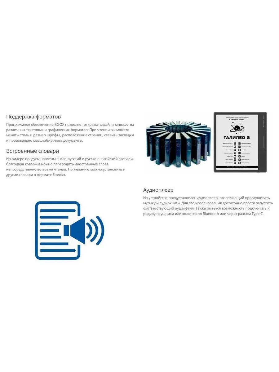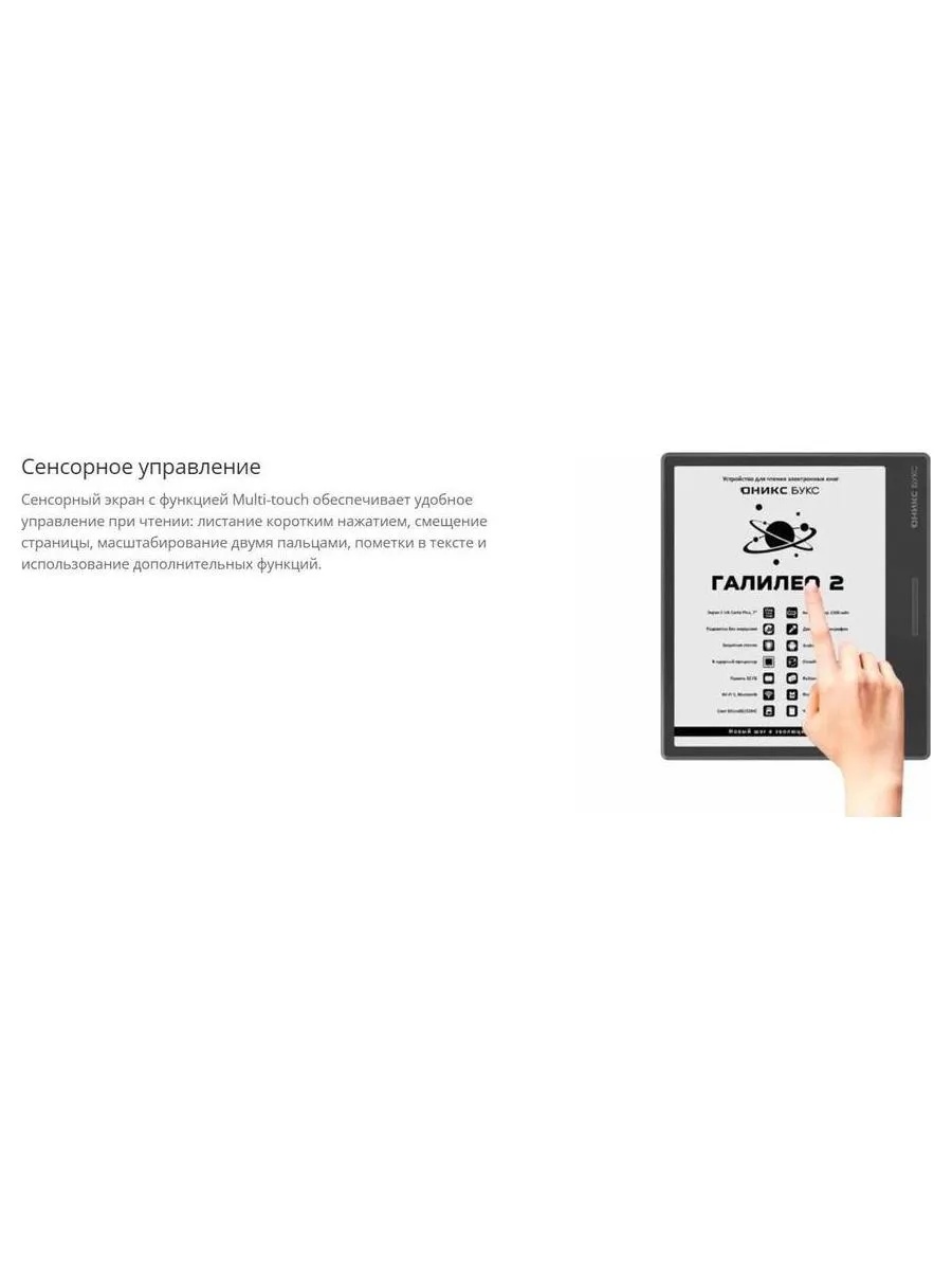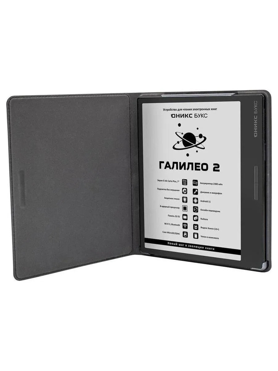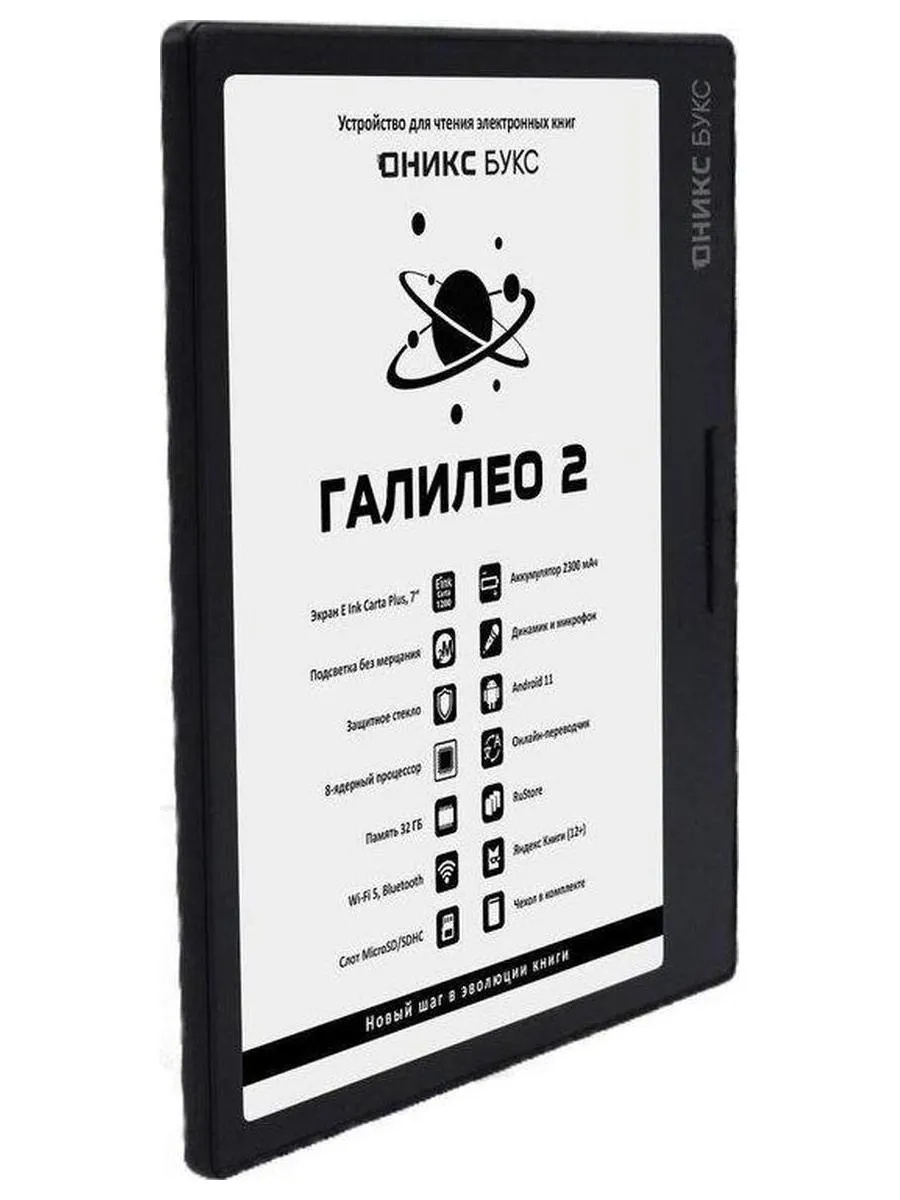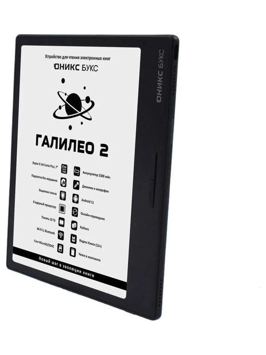 ОНИКС БУКС Галилео 2 — ридер с 7-дюймовым экраном высокого разрешения E Ink Carta Plus (Carta 1200) с подсветкой и сенсорным управлением. Благодаря увеличенному экрану Галилео 2 отображает на 30% больше информации, чем стандартные 6-дюймовые модели. Устройство имеет высокопроизводительную аппаратную платформу и базируется на ОС Android 11, позволяющей устанавливать и использовать дополнительные приложения. Ридер оборудован современными модулями Wi-Fi и Bluetooth, а 32 гигабайта встроенный памяти в сочетании со слотом microSD позволяют хранить огромную библиотеку книг и документов на устройстве. Аудиоплеер дает возможность прослушивать аудиокниги и музыку через встроенный динамик или наушники. Ридер выполнен в тонком компактном корпусе с кнопками управления на боковой стороне, а экран модели закрыт защитным стеклом. В комплекте с устройством поставляется «умная» защитная обложка.