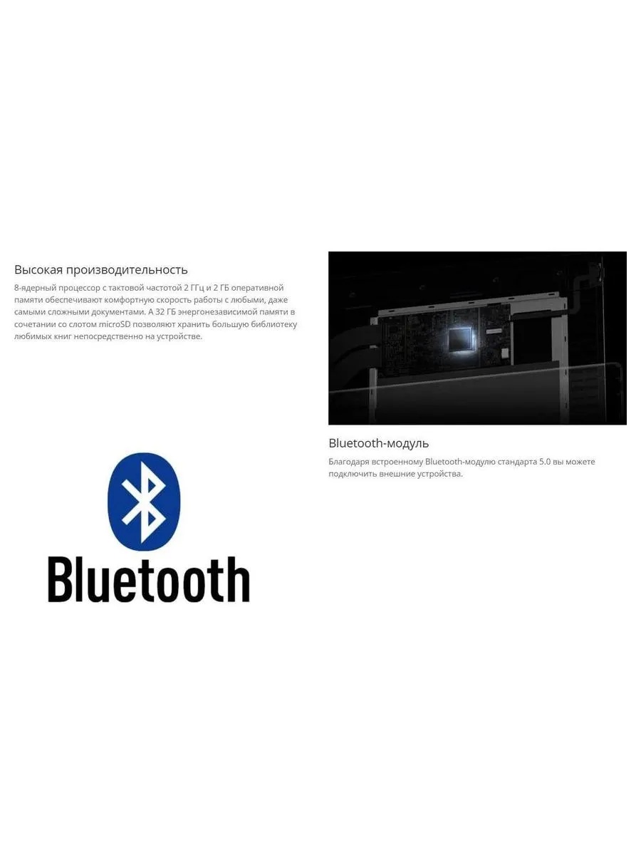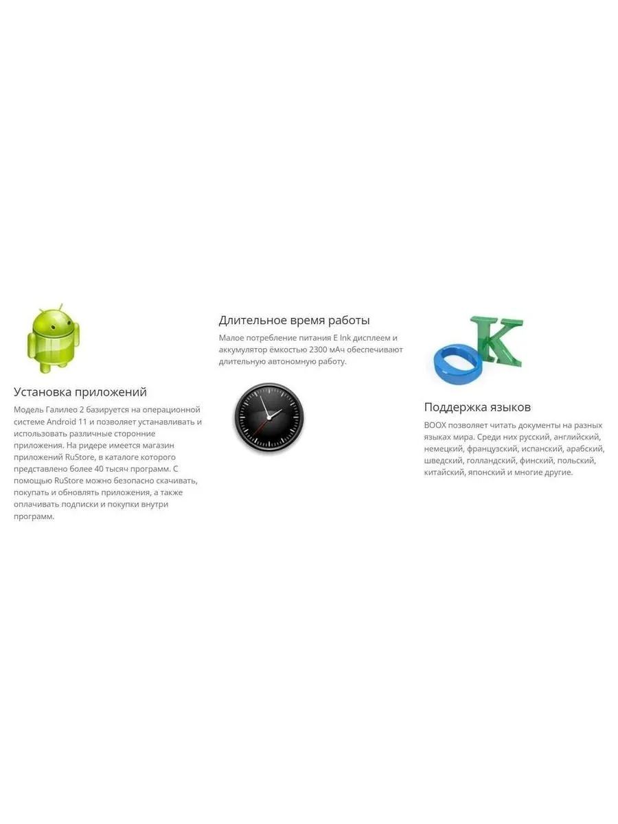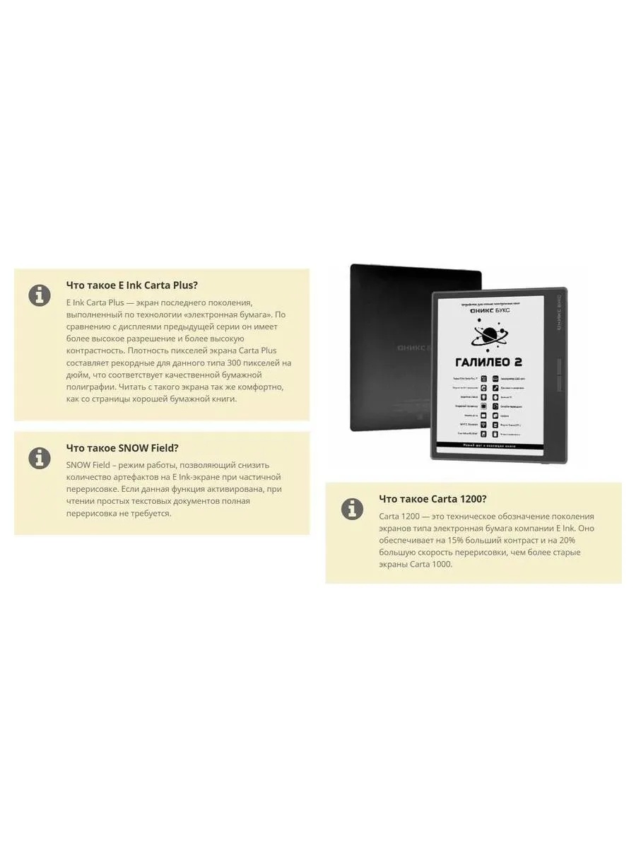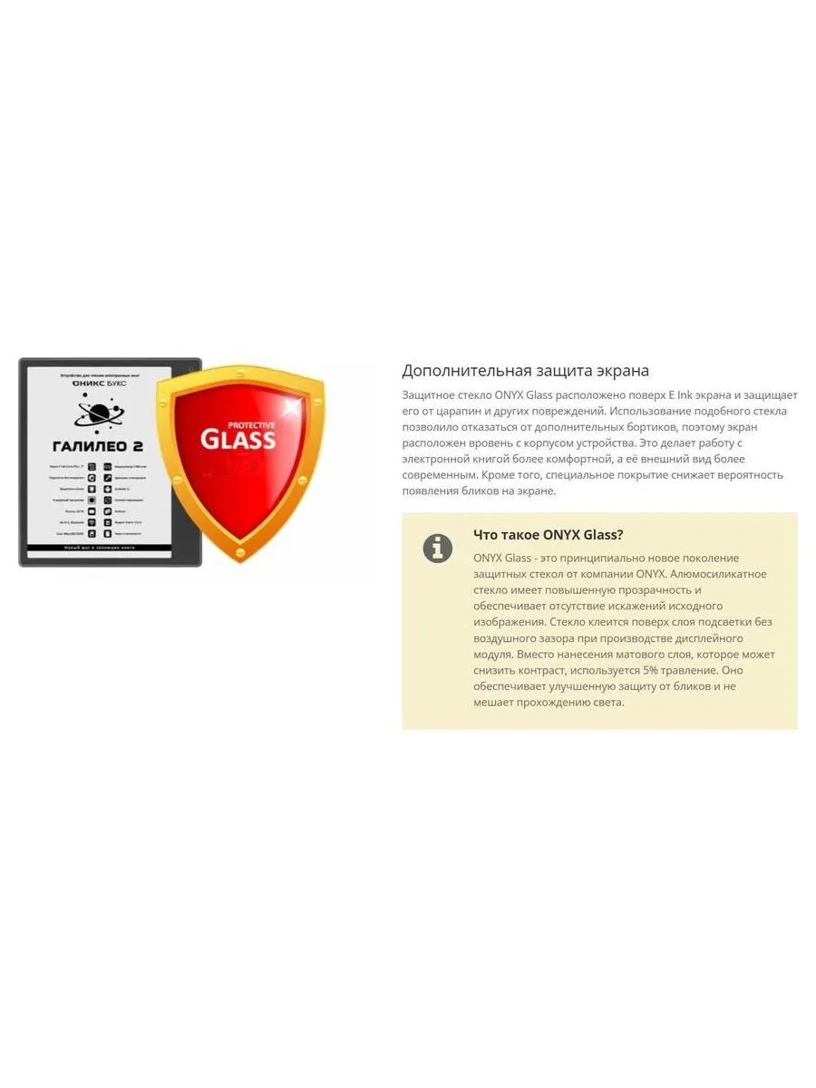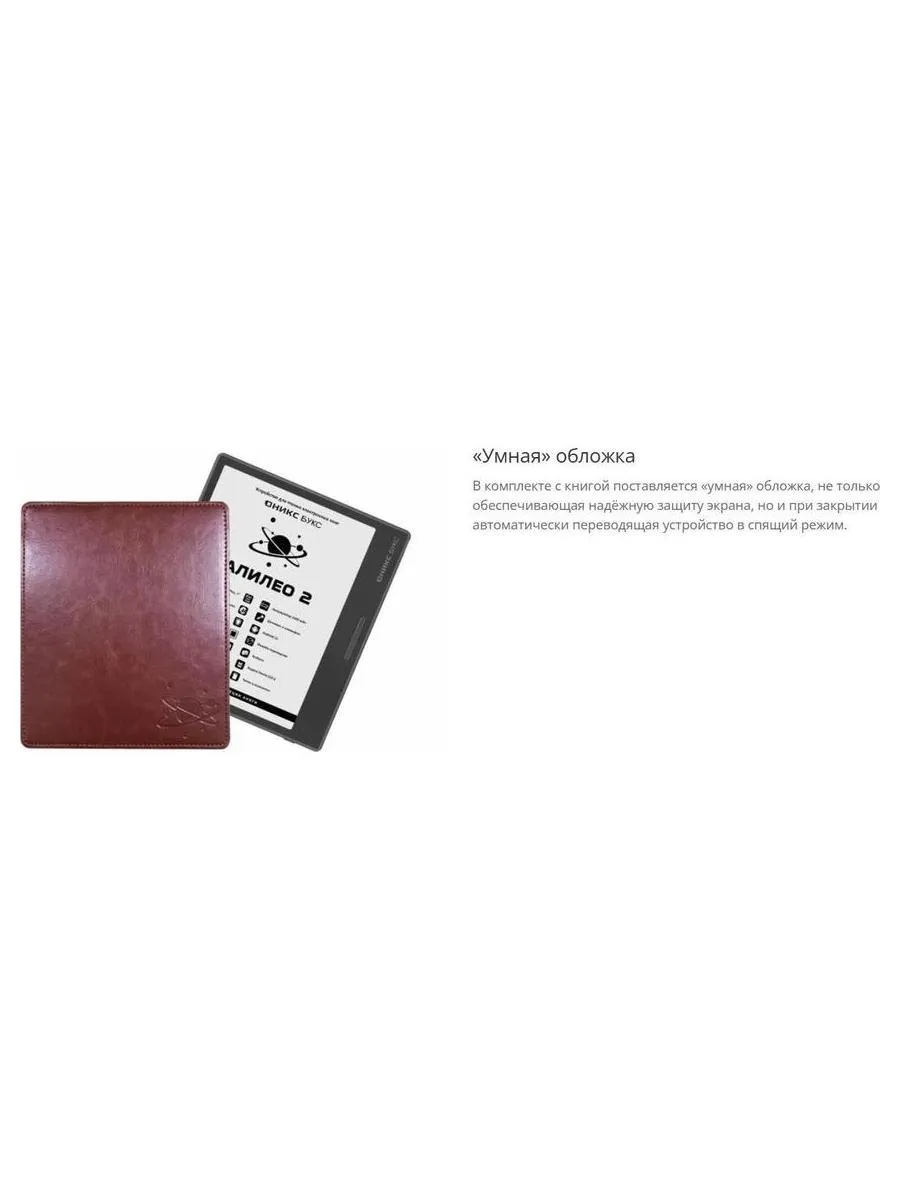 ОНИКС БУКС Галилео 2 — ридер с 7-дюймовым экраном высокого разрешения E Ink Carta Plus (Carta 1200) с подсветкой и сенсорным управлением. Благодаря увеличенному экрану Галилео 2 отображает на 30% больше информации, чем стандартные 6-дюймовые модели. Устройство имеет высокопроизводительную аппаратную платформу и базируется на ОС Android 11, позволяющей устанавливать и использовать дополнительные приложения. Ридер оборудован современными модулями Wi-Fi и Bluetooth, а 32 гигабайта встроенный памяти в сочетании со слотом microSD позволяют хранить огромную библиотеку книг и документов на устройстве. Аудиоплеер дает возможность прослушивать аудиокниги и музыку через встроенный динамик или наушники. Ридер выполнен в тонком компактном корпусе с кнопками управления на боковой стороне, а экран модели закрыт защитным стеклом. В комплекте с устройством поставляется «умная» защитная обложка.