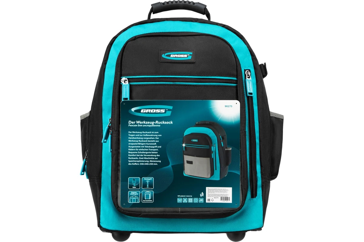 Рюкзак Gross 90275 размером 440 х 350 х 250 мм, с выдвижной рукояткой и колесами, используется для хранения и транспортировки ручного инструмента. В двух секциях с 16 внутренними и внешними карманами можно разместить все необходимые предметы. Рюкзак удобно брать в поездки и на выездные работы.