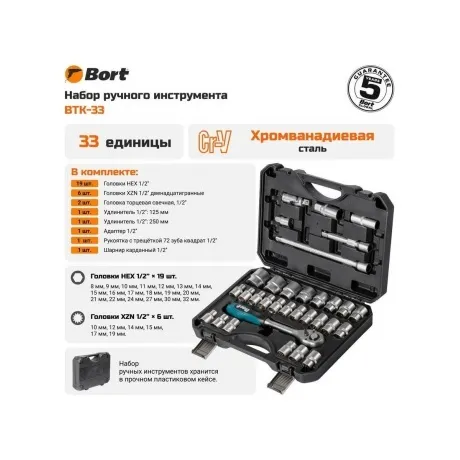 Набор инструментов BORT BTK-33 - это высококачественный набор, состоящий из 33 предметов, изготовленных из хромованадиевой стали. Этот материал обеспечивает высокую прочность и долговечность инструментов, а также устойчивость к коррозии.