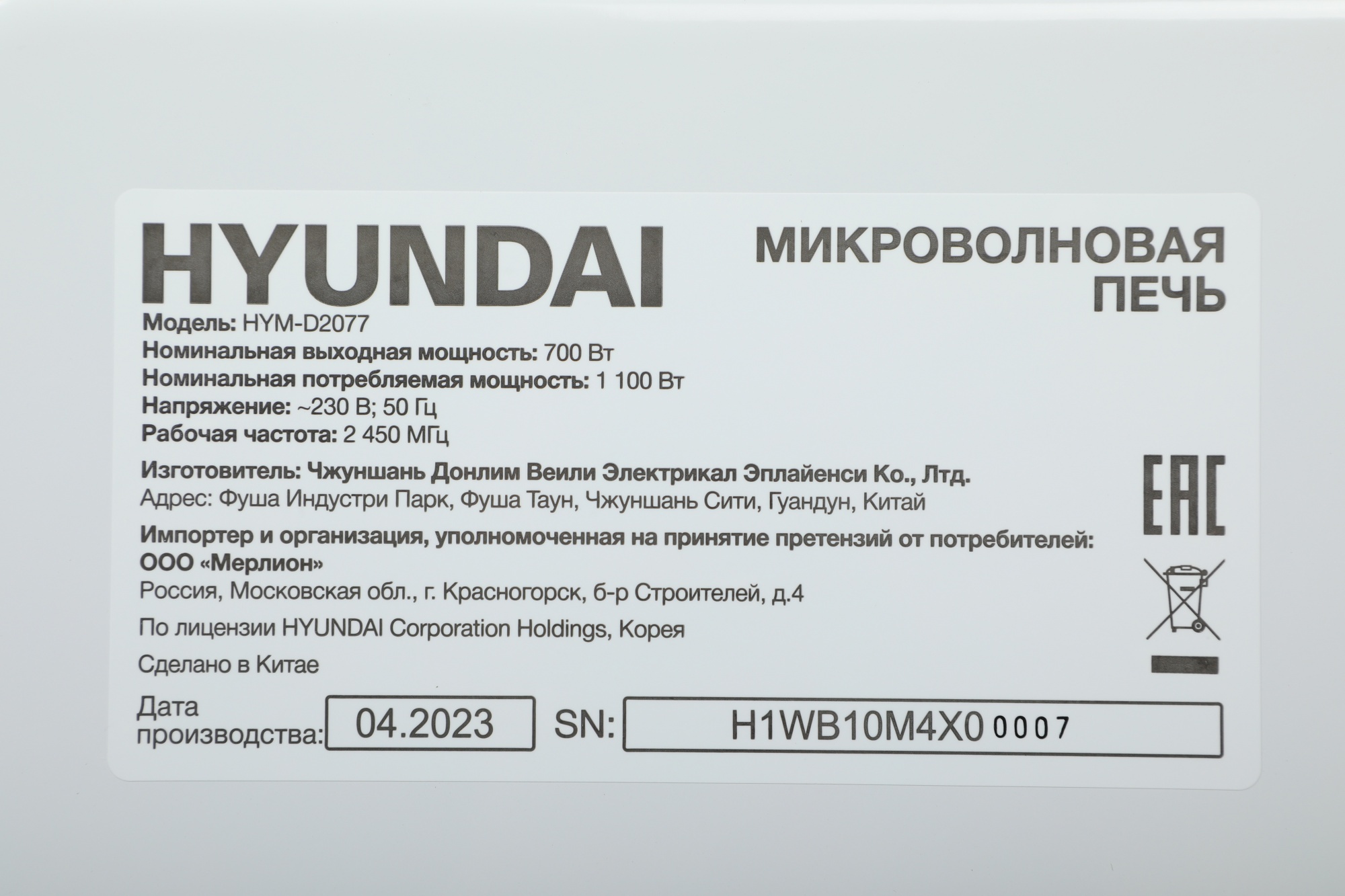 Описание товара Микроволновая печь Hyundai HYM-D2077 20л. 700Вт белая