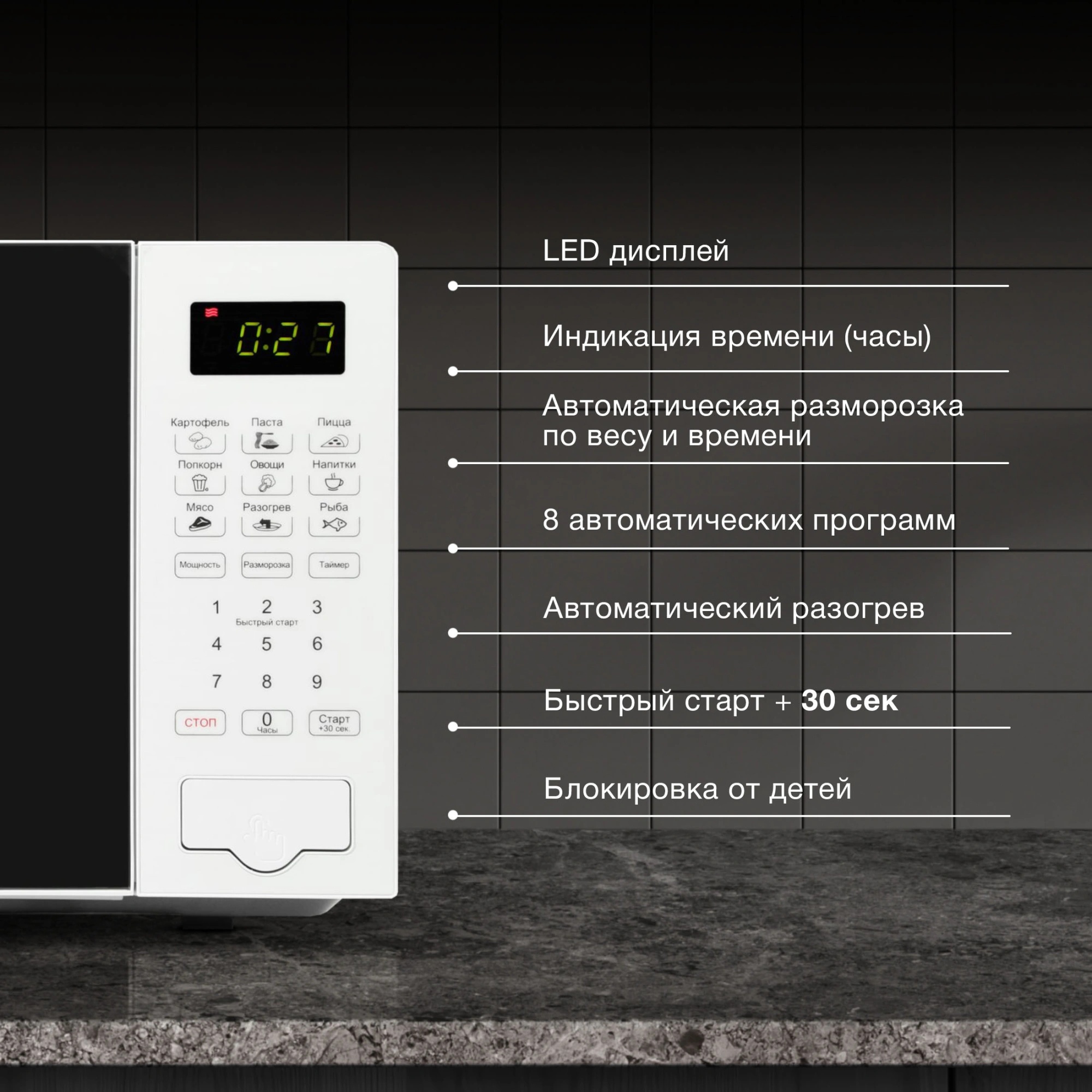 Микроволновую печь Hyundai HYM-D2077 станет незаменимым помощником на вашей кухне. Эта стильная модель выполнена в элегантном белом цвете и имеет компактные размеры, что позволяет удобно разместить ее на любой кухонной поверхности. С объемом 20 л данная модель отлично подходит для разогрева и приготовления различных блюд. Она оснащена электронным управлением, что делает использование интуитивно понятным и удобным. Мощность микроволн составляет 700 Вт, что позволяет быстро и эффективно справляться с задачами по разогреву и приготовлению пищи. Наличие дисплея обеспечивает наглядность в процессе работы и легкость в настройках. Дверца открывается нажатием кнопки, что добавляет удобства в использовании. Внутреннее покрытие камеры выполнено из эмали, что облегчает процесс уборки. Эта микроволновая печь обладает множеством полезных функций. Автоматическая разморозка позволяет быстро и удобно разморозить продукты, а функция автоматического разогрева делает процесс еще проще. Также имеется возможность автоматического приготовления, что поможет вам с легкостью готовить любимые блюда. Для обеспечения безопасности в доме предусмотрена блокировка от детей. Эта микроволновая печь станет отличным решением для вашей кухни, сочетающим в себе стиль, функциональность и безопасность.