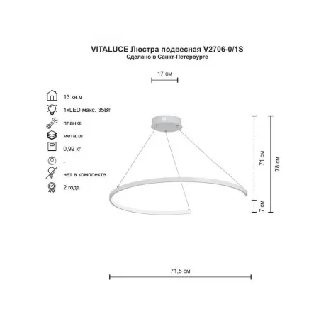светодиодная подвесная люстра vitaluce v2706-0/1s мощностью 35 вт с цветовой температурой 4000к и световым потоком 3460 лм обеспечивает освещение площади до 13 кв.м