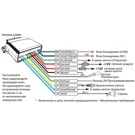 Подкапотный модуль подключения сирены, концевика капота, термодатчика двигателя, электромеханическим замком капота и цифровой линии управления подогревателями типа Webasto и Eberspaecher.