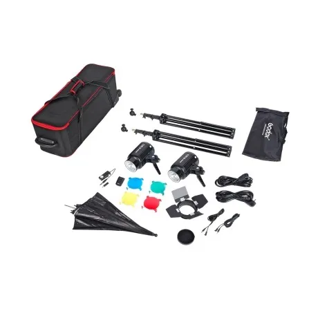 Моноблок Godox E120 — 2 шт, Стойка-тренога Godox 304 — 2 шт, Софтбокс SB-MS6060 — 1 шт, Фотозонт UB-002 84 см серебро/чёрный — 1 шт, Шторки с набором фильтров BD-03 — 1 шт, Комплект радиосинхронизации Godox RT-16 — 1 шт, Синхрокабель - 2 шт, Сумка Godox CB-04 — 1 шт