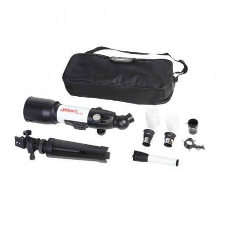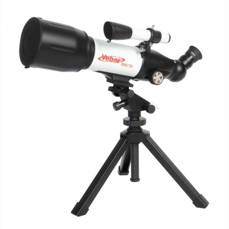 Телескоп Veber 350/70 – компактный телескоп-рефрактор. Он удобен как для домашних наблюдений, так и для вылазок на природу. Его длина составляет всего 45 см, он легкий и компактный. Ахроматическая оптика дает четкое и контрастное изображение. С набором окуляров, входящих в комплект, можно получить увеличение от 17,5 до 116,4 крат.