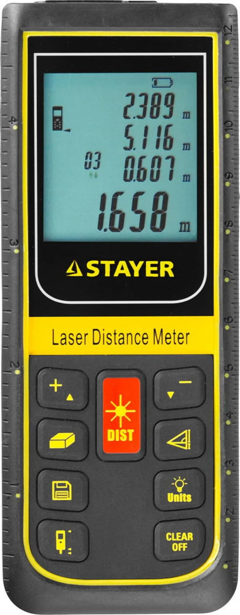 Компактный лазерный дальномер STAYER серии PROFESSIONAL – профессиональный высокоточный многофункциональный прибор для быстрого и простого измерения линейных расстояний, площадей и объемов в помещении и на улице. Позволяет проводить весь цикл измерений одному человеку, значительно ускоряя выполнение разметочных работ.