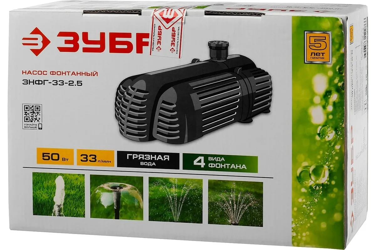 Фонтанный насос Зубр ЗНФГ-33-2.5 подходит для перекачивания воды, содержащей включения диаметром до 15 мм. На входе установлен губчатый фильтр с крупными ячейками, который предотвращает попадание твердых частиц в механизм. Насос предназначен для организации мини-водопада или фонтана на садовом пруду. При помощи удлинительной трубки можно отрегулировать высоту основания фонтана. Максимальная глубина установки насоса - 3 метра.