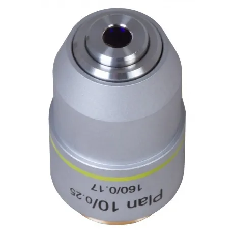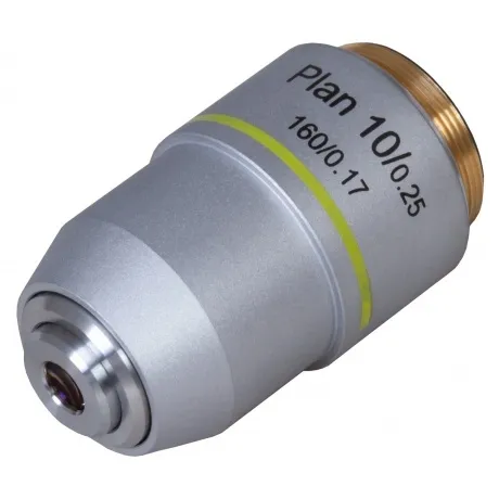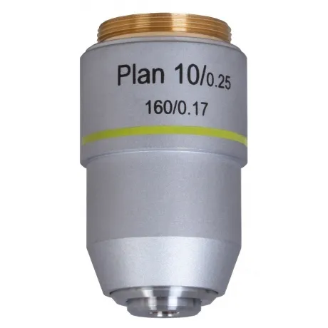 Материал линз: оптическое стекло / Материал корпуса: медь / Оптическая конструкция: планахромат / Увеличение, крат: 10 / Апертура: 0,25 / Рабочее расстояние, мм: 5,84 / Парфокальное расстояние, мм: 195 / Толщина совместимого покровного стекла, мм: 0,17 / Длина совместимого тубуса, мм: 160 / Тип резьбы: WJ 4/5*1/36 / Пружинящая оправа: нет / Масляная иммерсия: нет.