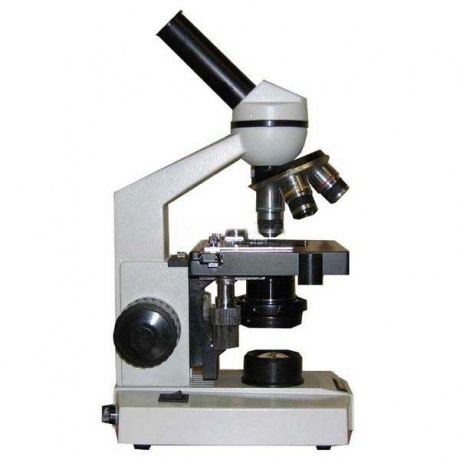 Биомед 2 – микроскоп с регулируемым увеличением в диапазоне от 40 до 1000 крат. Предназначен для наблюдений в проходящем свете по методу светлого поля. В качестве источника света в конструкции микроскопа используется светодиод, для питания которого требуется подключение к сети 220 В. Монокуляр оснащен револьверной головкой на 4 гнезда, позволяющей быстро выбрать нужный объектив. Все идущие в комплекте объективы являются ахроматами. Также микроскоп оснащен двухкоординатным предметным столиком и иммерсионным конденсором со встроенной апертурной диафрагмой. Механизм фокусировки включает ручки грубой и точной настройки, коаксиально расположенные в левой части микроскопа.