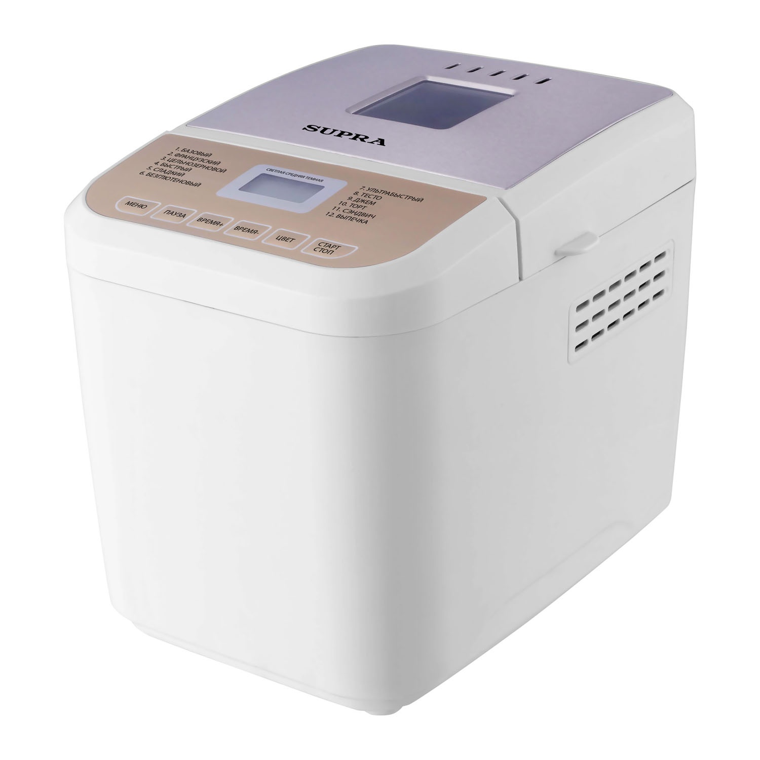 Хлебопечка Supra BMS-210 поможет приготовить в домашних условиях ароматный хрустящий, натуральный хлеб, как из русской печи. Хозяйке нужно лишь загрузить ингредиенты, указанные в рецептуре, и запустить программу. Хлебопечка сама произведет замес, расстойку теста и испечет хлеб. По окончании программы прозвучит звуковой сигнал, после которого необходимо вынуть буханку из формы. 12 встроенных программ позволяют готовить не только разные сорта хлебобулочных изделий, но и сварить варенье. Можно отложить запуск на срок до 13 часов. В комплектацию входит книга с рецептами, мерные емкости, форма для выпечки с антипригарным покрытием. Корпус выполнен из пластика белого цвета с бежевыми элементами. Удобное русифицированное меню. На дисплей выводится информация об этапе приготовления и времени окончания работы. Через смотровое окошечко в крышке можно контролировать процесс.