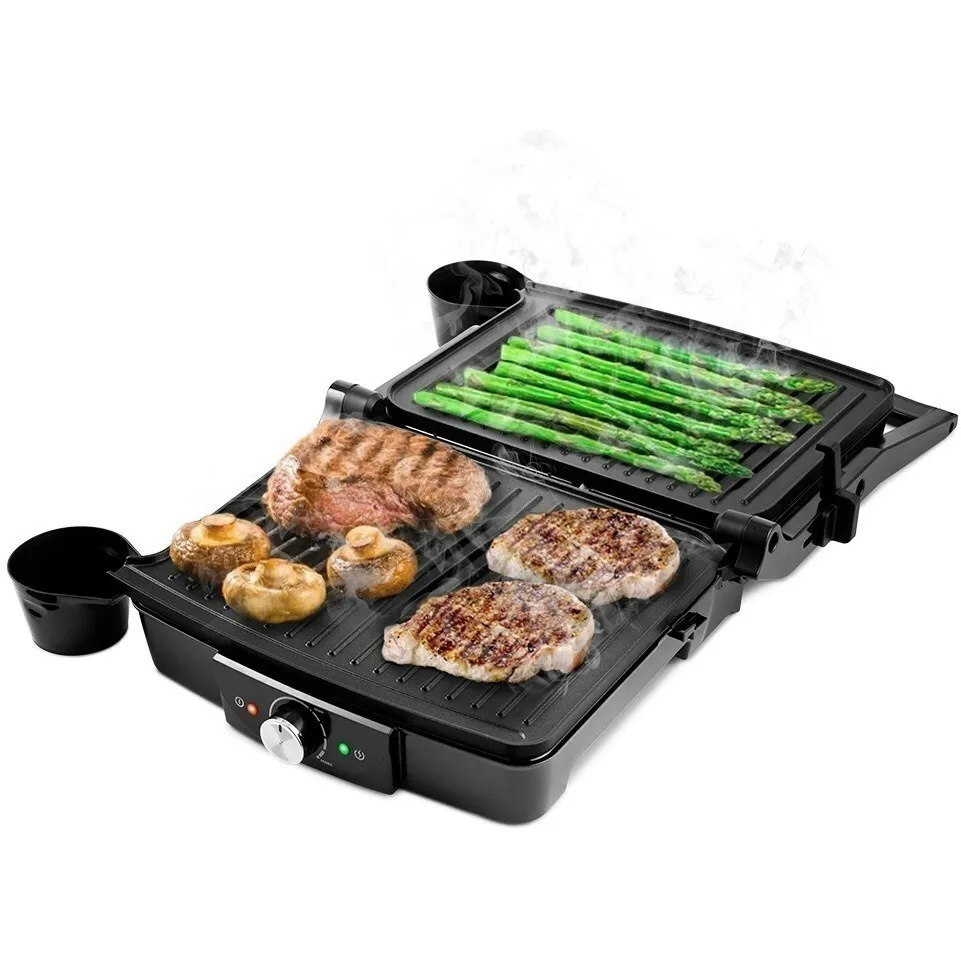 Электрогриль КТ-1656 предназначен для приготовления мяса, рыбы, овощей, сосисок, бутербродов, сэндвичей, гренок, тостов! Высокая t способствует быстрому приготовлению продуктов, а ребристая поверхность – появлению на них характерного «полосатого» рисунка. Панели изготовлены из алюминия с нанесённым антипригарным покрытием. Для очистки пластин их достаточно просто протереть пока они не остыли. Регулятор t позволяет плавно регулировать t приготовления от мин – 100-140°С, до макс – 180-220°С. Индикатор нагрева горит в то время, когда включен нагревательный элемент. Индикатор питания загорается при подключении гриля к сети и гаснет при отключении. В одностороннем режиме крышка гриля откидывается на 180°, благодаря чему гриль превращается в большую жаровню, а продукты можно выложить сразу на две панели. Для раскладывания гриля предусмотрена специальная кнопка на боковой части корпуса.