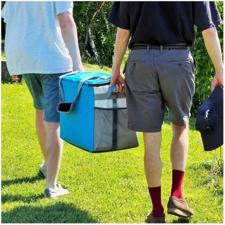 Сумка-холодильник «ДИСКАВЕРИ» в цвете «Морской синий» с герметичным внутренним отделением, который легко моется и защищает сумку от протекания. Внешнее покрытие сумки – армированный, влагоотталкивающий PVC материал. Изоляционный слой Biofoam толщиной 40 мм для длительного удержания температуры. Водонепроницаемая молния с двумя застежками. На внешней стороне термосумки предусмотрены эластичные боковые сетчатые карманы. Удлиненный регулируемый по длине ремень выполнен из прочной мягкой ткани. В термосумке с увеличенным объемом (40 л) предусмотрено съемное дно с дополнительной термоизоляцией для поддержания формы или для создания отделов внутри сумки. Дополнительно на ремне предусмотрена мягкая накладка на плечо и боковые ручки для удобной переноски. Аккумуляторы холода в комплект не входят.