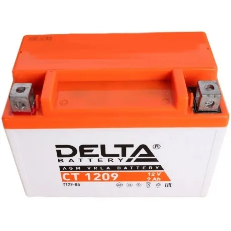 Герметизированный необслуживаемый VRLA cвинцово-кислотный стартовый аккумулятор Delta CT 1209 напряжением 12В и емкостью 9Ач. Обладает стартовым током в 135А. Полярность - прямая (+ -). Аккумулятор соответствует следующему коду YUASA: YTX9-BS, YTX9. Разработан специально для пуска двигателей мототехники. Изготовлен по технологии AGM (с микропористым заполнителем, пропитанным электролитом) из негорючего ABS пластика. Срок службы аккумулятора достигает 3-5 лет. Высокая стартовая мощность и повышенная энергоотдача. Адаптирован к Российским условиям эксплуатации.