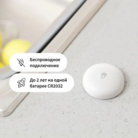 Беспроводной датчик Aqara Water Leak Sensor T1 зафиксирует протечку и пришлёт вам уведомление на смартфон. Положите его в место возможной протечки и предотвратите порчу имущества. Для работы устройства в экосистеме необходим Центр умного дома (хаб) с поддержкой Zigbee 3.0. Особенности Беспроводной датчик защищён от пыли и влаги по стандарту IP67. Это значит, что если погрузить датчик в воду на глубину до 1 м и на срок до получаса, то после этого датчик продолжит исправно работать. Поэтому вы можете не переживать за работу датчика. У обновлённой версии T1 есть ряд преимуществ: она энергоэффективнее, чем предыдущая верси. Поэтому батарея будет разряжаться медленнее. Как работает На обратной стороне датчика находятся два металлических контакта. Если они коснутся воды, то датчик отправит сигнал на Хаб. А Хаб, в свою очередь, включит сигнализацию и отправит push-уведомление на смартфон. Питание Работает на одной батарее CR2032 до двух лет. Когда батарея начнёт разряжаться, вам придёт уведомление на смартфон. Протокол связи и совместимость Для работы датчика используется версия протокола Zigbee 3.0. Автоматизации Защитите имущество. Датчик может отдавать команду на перекрытие клапана, через который поступает вода. Для этого добавьте к датчику Умное реле. Тогда Умный дом не только сообщит об аварии, но и сам перекроет воду. Положите датчик протечки под ванну, раковину, стиральную или посудомоечную машину. И не переживайте за то, что испортите имущество или затопите соседей. Почему нужен Центр умного дома (хаб)x Центр умного дома выполняет роль моста между устройствами Aqara и Wi-Fi роутером. Аксессуары Aqara подключаются по протоколу Zigbee, который разработан специально для Умного дома.