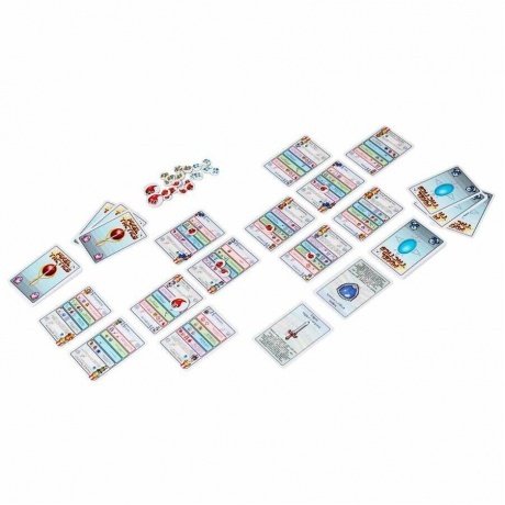 25 карт красного отряда, 25 карт синего отряда, карта первого игрока, карта второго игрока, 14 маленьких жетонов ранений, 3 больших жетона ранений, 8 жетонов времени, 8 маркеров смены, правила