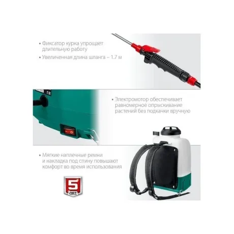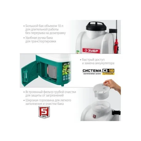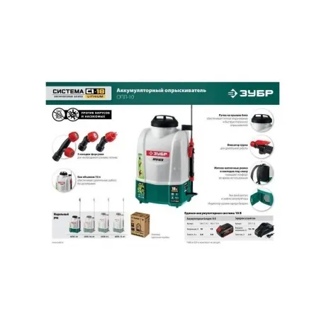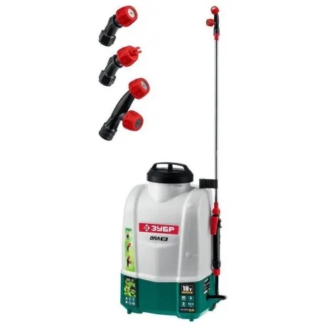 Аккумуляторный опрыскиватель ЗУБР 10 л ОПЛ-10 отличается эффективностью, мобильностью, экологичностью. Бережно орошает растения. Подходит для дезинфекции, мытья окон и стен. Работает от литий-ионного аккумулятора напряжением 18 В (приобретается отдельно). За счет наличия ремней обеспечивается удобство переноски на спине.