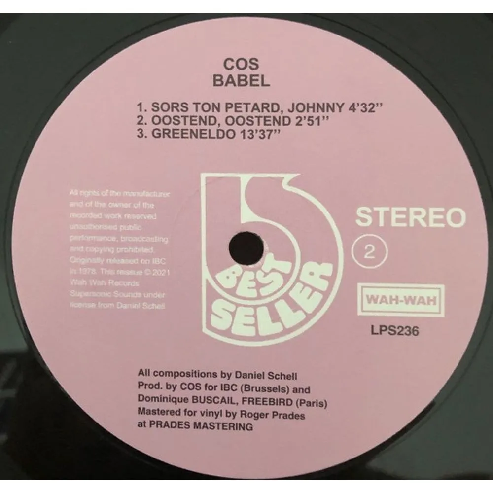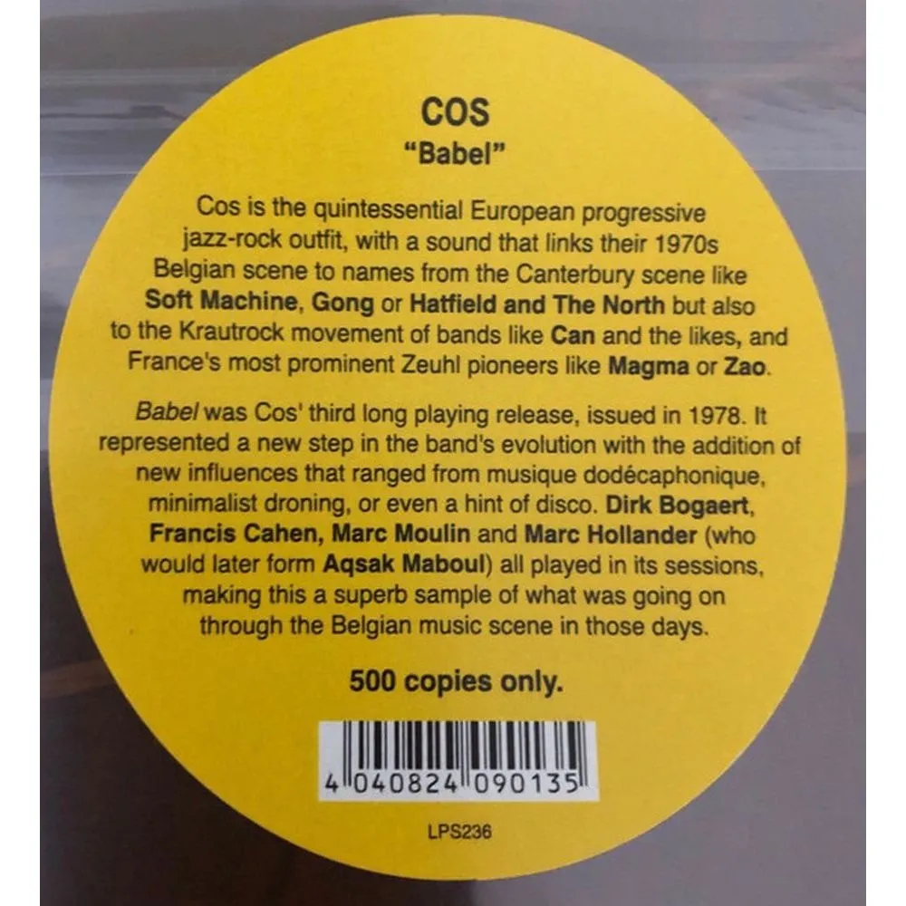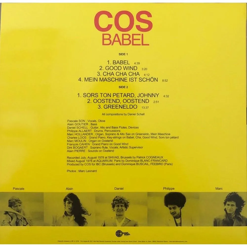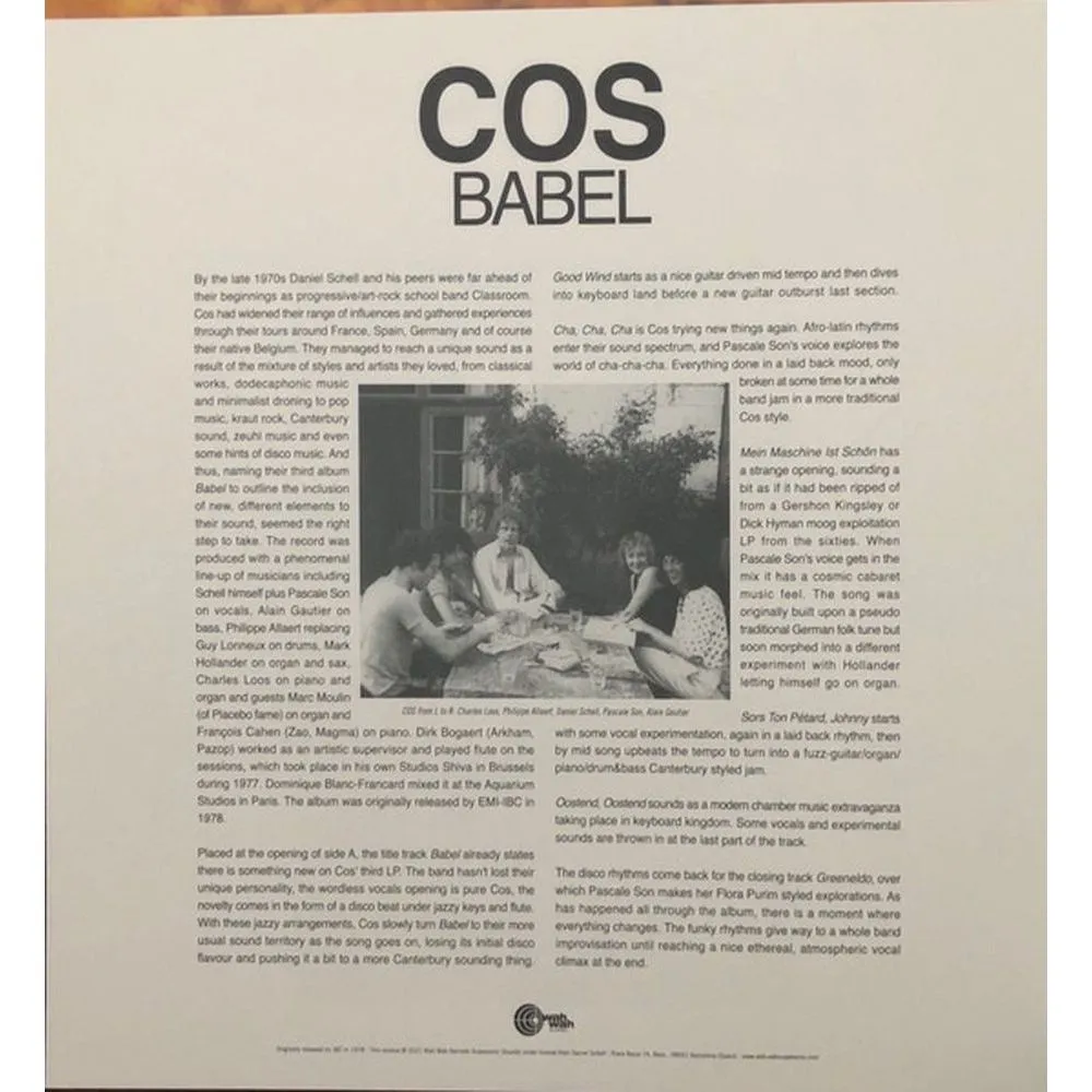 История Cos началась во второй половине шестидесятых, когда Даниэль Шелл объединил усилия с Жан-Полем Мюзеттом, Паскаль Сон и Робертом Перне, образовав группу Classroom. После распада Classroom Даниэль Шелл и Паскаль Сон продолжили свою деятельность и вместе с Чарльзом Лоосом, Аленом Гутье и Бобом Дарчем создали Cos. Они создали экспериментальное джаз-роковое звучание, связанное с вышеупомянутыми влияниями, но не являясь простыми подражателями, поскольку всегда сохраняли свою индивидуальность. Babel стал третьим полноформатным альбомом Cos, выпущенным в 1978 году. Он представлял собой новый этап в эволюции группы, добавив новые влияния, варьирующиеся от додекафонической музыки и минималистского дронинга до даже намека на диско, не отступая при этом от своей прежней любви к кентерберийским звукам или более традиционному джаз-року. Дирк Богаерт, Фрэнсис Каэн и Марк Мулен принимали участие в записи альбома, что делает его превосходным образцом того, что происходило на бельгийской музыкальной сцене в те дни. Переиздание альбома Wah Wah выпущено в великолепной обложке, воспроизводящей оригинальный дизайн. Ограниченный тираж — 500 экземпляров, выпущен по лицензии в сотрудничестве с Даниэлем Шеллом.