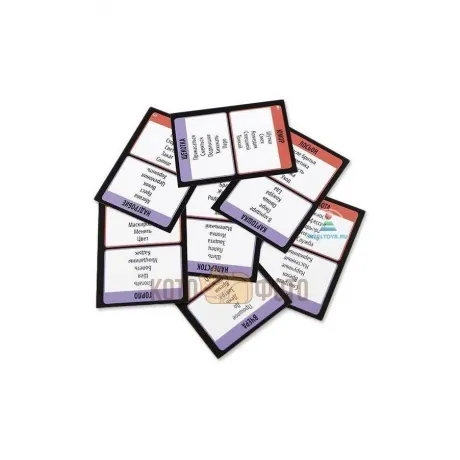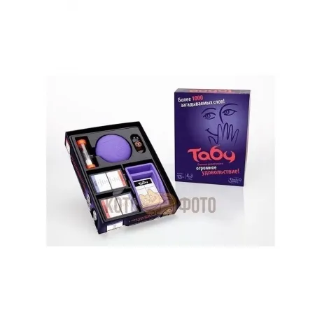 Настольная игра Hasbro Other games Табу заключается в словесном описании того или иного предмета без использования определенных слов, на которые правилами игры наложено табу. Игроки делятся на две команды, между ними в специальном лотке находятся двусторонние карточки с названиями описываемых предметов и списком запрещенных к использованию в их описании слов. Задача водящего игрока - за минуту красочно рассказать членам своей команды о предмете, не употребляя запрещенных терминов, чтобы игроки поняли, о чем идет речь. За исполнением правил следит игрок из противоположной команды, который находится рядом с водящим. Контролер наблюдает за песочными часами, отмеряющими минуту, а при допущенных нарушениях с помощью специальной резиновой пищалки подает звуковой сигнал. Отгаданные слова приносят команде очки. Настольная игра Hasbro Other games Табу обогащает словарный запас, тренирует мышление и развивает речь.