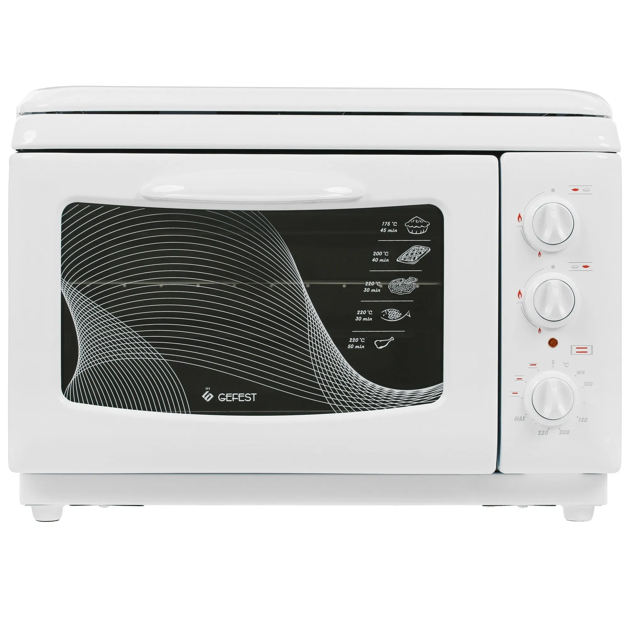 Внутри GEFEST ПГЭ 120 эффективно сохраняет тепло благодаря двойному стеклу дверцы. Встроенный гриль позволяет удачно готовить мясные, рыбные блюда, запекать овощи. Справа от дверцы располагаются три поворотные ручки, две из которых используются для работы с конфорками, а одна из них ? для настройки температуры и режима.