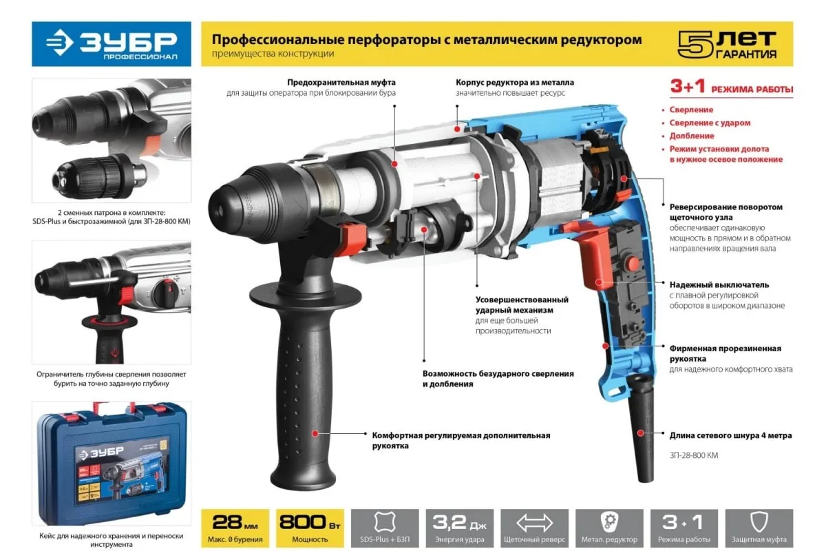 Перфоратор Зубр ЗП-32-1100 К оборудован креплением бура SDS-Plus. Надежность прибора увеличивается благодаря применению для передачи вращающего момента металлического редуктора. Его можно использовать для сверления (как с ударом, так и без) и долбления. При мощности 1100 Вт Зубр ЗП-32-1100 К способен производить до 5100 ударов и развивать скорость вращения (на холостом ходу) до 920 оборотов за минуту. Для удобного хвата имеется съемная дополнительная рукоятка. Глубину сверления можно установить с помощью ограничителя, количество оборотов плавно регулируется. Прибор работает только от сети, длина кабеля (4 м) обеспечивает свободу для маневров. Перфоратор упакован в пластиковый кейс с ручкой для переноски вместе с документами, смазкой для бура и глубиномером.