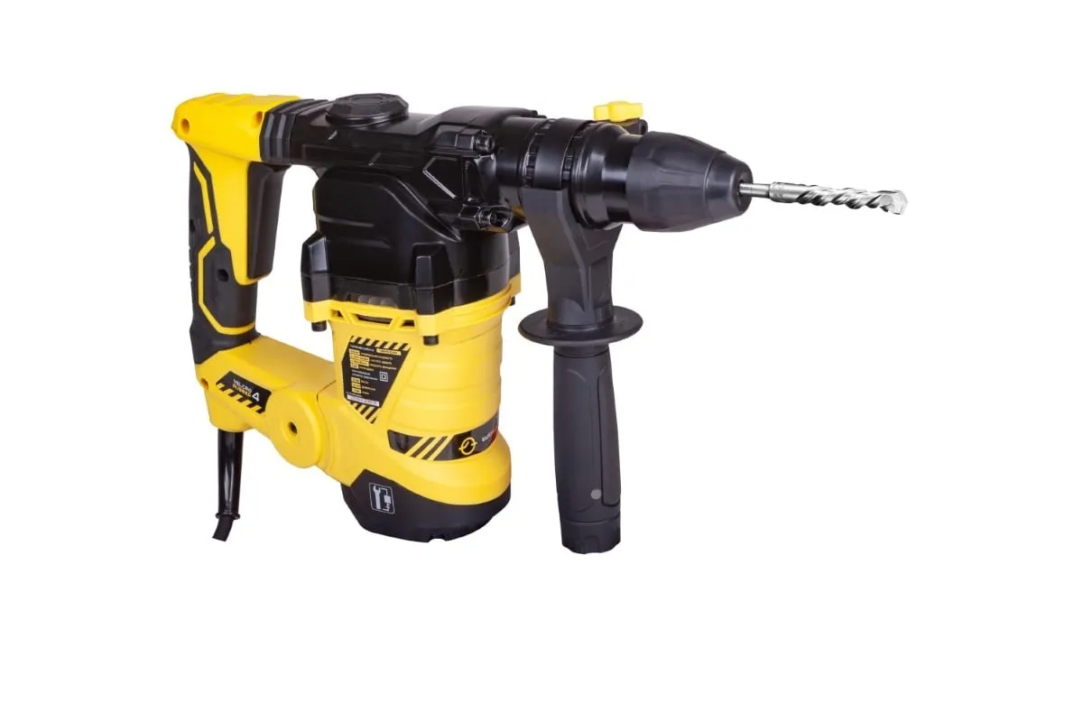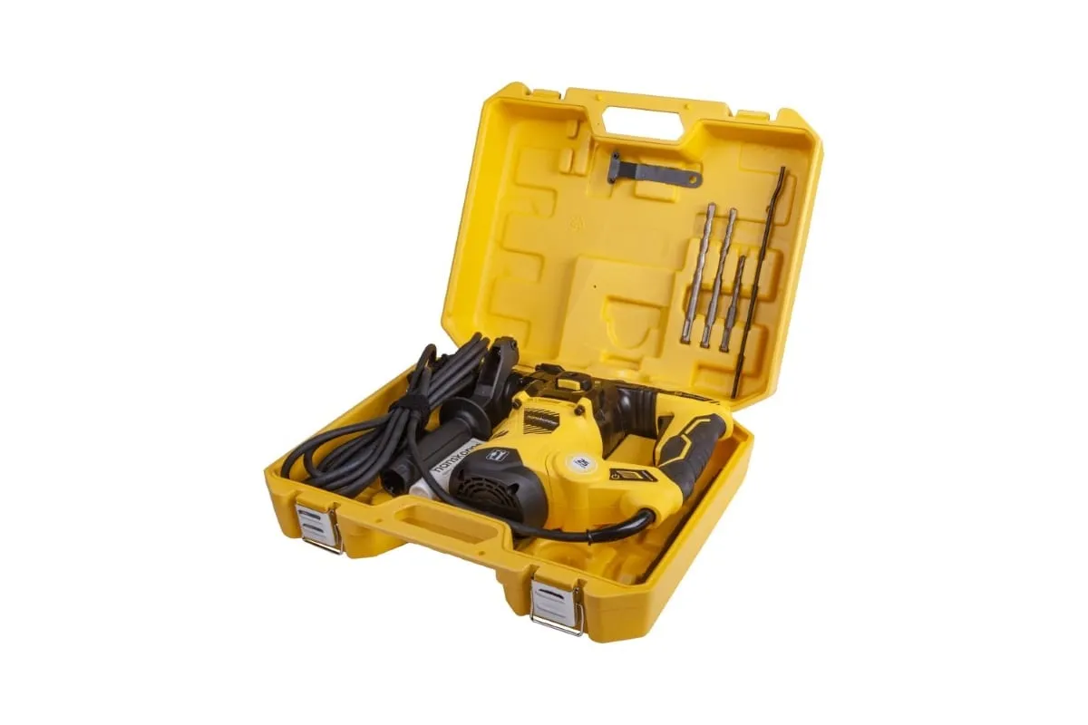 Новая система выбора режима работы одним переключателем Индикатор подключения к сети Защита от вибрации 4 м резинового кабеля - свобода перемещения. Комплектация: 3 бура по бетону (6*150, 8*150, 10*150), 1 плоское зубило 14*250, смазка для буров, ограничитель глубины сверления, дополнительная рукоятка.