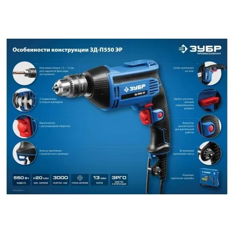 Дрель безударная Зубр ЗД-П550 ЭР - этот товар вы можете купить в нашем интернет-магазине по цене 3243 руб. Цены, фото и описания представлены на карточке товара. Звоните по телефону 8(812)426-98-99 в Калининграде.