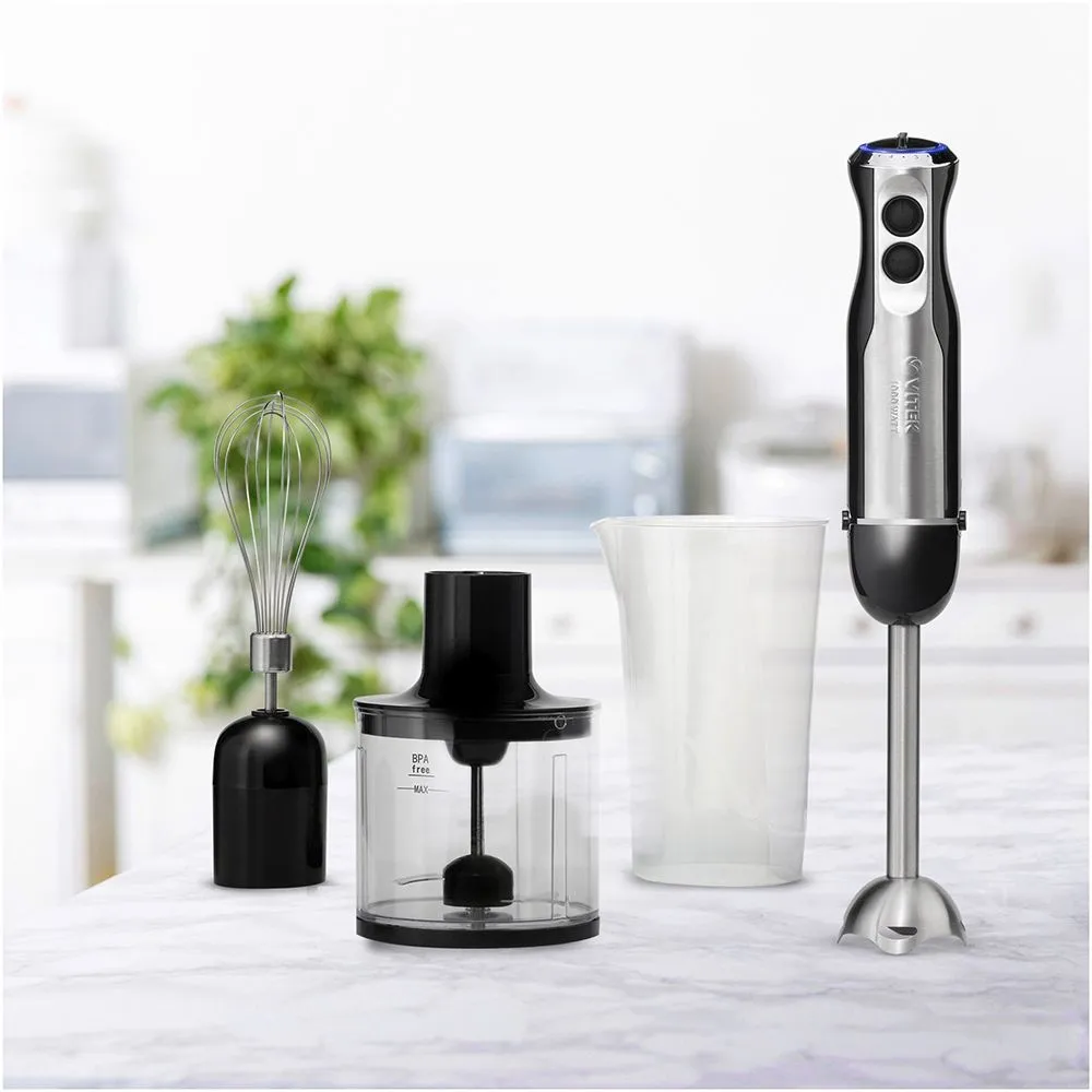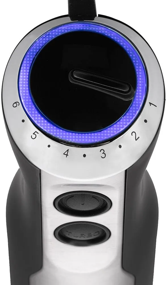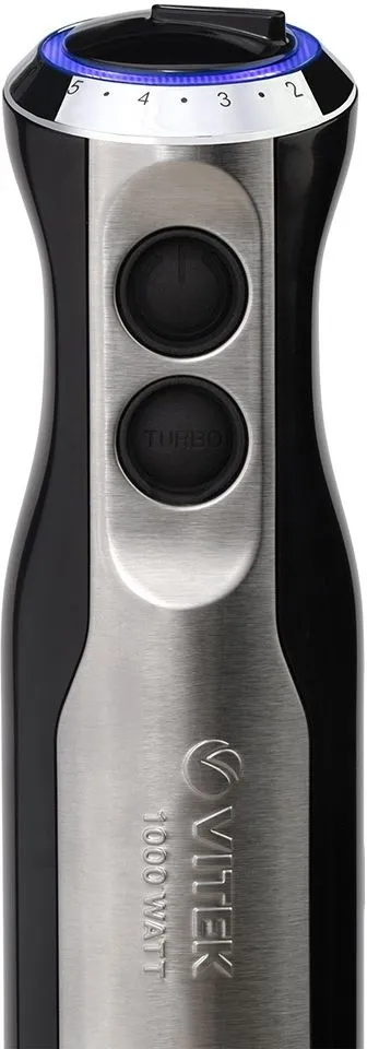 Блендер Vitek VT-8543Идеально справиться со смешиванием или измельчением ингредиентов блюда способен погружной блендер VITEK VT-8543. В комплект к нему входят чаша объемом 500 мл, высокий стакан объемом 600 мл и насадка-венчик. Отличительной особенностью блендера является плавная регулировка 6-ти предусмотренных в приборе скоростей. А для самых сложных случаев в нем имеется режим TURBO, который легко справится даже с самыми твердыми ингредиентами. Нельзя не отметить и необыкновенный комфорт в эксплуатации устройства, который обеспечивает световой индикатор работы прибора — красивая LED-подсветка.