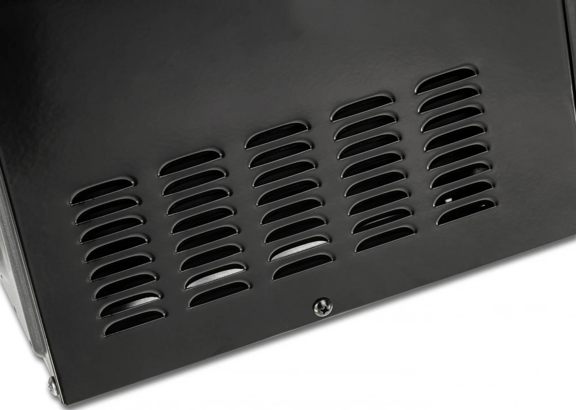 Основная часть корпуса, скрывающая весь механизм, изготовлена из металла, дверца и передняя панель – из пластика. На верхней части и по бокам предусмотрена перфорация для вывода горячего воздуха, образующегося во время нагрева, что стоит учитывать в момент установки прибора – нужно обеспечить небольшое расстояние от стенки и по бокам, для свободного оттока воздуха. Сама же дверца имеет зеркальное покрытие, что добавляет элегантности и оригинальности дизайну. Открытие осуществляется с помощью ручки.