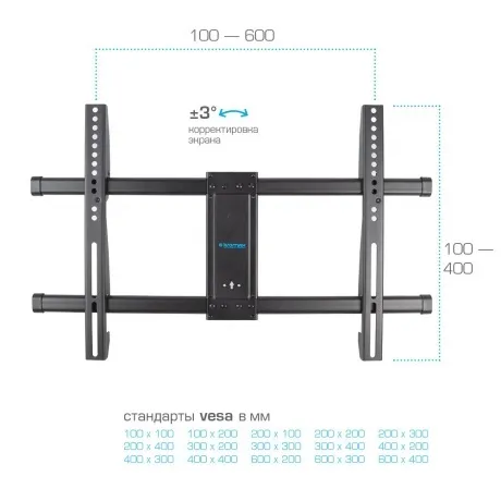 Усиленное настенное основание - широкая монтажная пластина обеспечивает надежное крепление ТВ на стену, Надежная стальная конструкция максимальная нагрузка до 60 кг, Универсальная система крепления, Легкий монтаж при помощи съемной монтажной пластины, Корректировка экрана - уникальная возможность вращения экрана на ±3° относительно стены