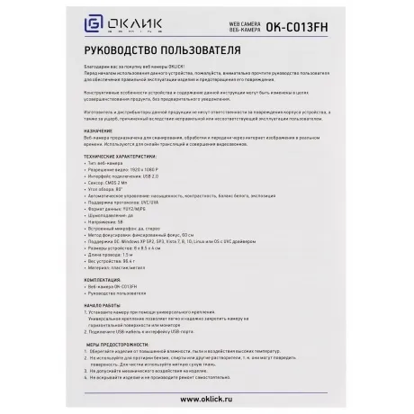 Веб-камера Oklick OK-C013FH черный - стоимость товара 1592 руб. в интернет-магазине КотоФото. Характеристики, фото и описание доступны на карточке товара. Купить товар можно на сайте онлайн или заказать по телефону 8(812)426-98-99 в Калининграде, а забрать в пункте самовывоза или оформить доставку на дом.