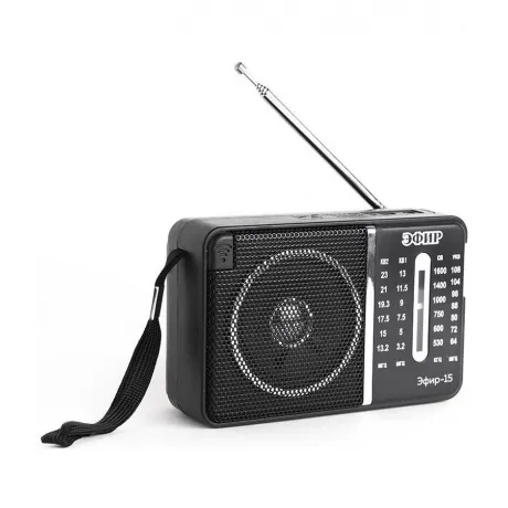 Компактный радиоприемник Эфир 15, представленный в традиционном черном цвете корпуса, имеет все необходимое для уверенного приема радиосигнала в диапазонах FM (64 МГц - 108 МГц), AM (530 кГц - 1600 кГц), КВ1КВ2 (3,2 - 23 МГц). Устройство транслирует звук в моно-формате, для чего в его конструкции имеется один динамик с выходной мощностью 8 Вт. Выбор частоты радиовещания осуществляется при помощи удобного поворотного переключателя. Уверенный прием радиочастот гарантирует телескопическая антенна. Удобству транспортировки радиоприемника способствует шнурок. Модель Эфир 15 предусматривает выход на наушники, чтобы звуки любимых радиопередач не мешали окружающим. Для автономной работы прибора имеется встроенный аккумулятор, полного заряда которого хватит на многие часы непрерывного радиовещания. Весящий 200 г радиоприемник обладает компактными размерами (135x90x60 мм - ширина, высота и глубина соответственно), поэтому он станет неизменным спутником любого путешественника.
