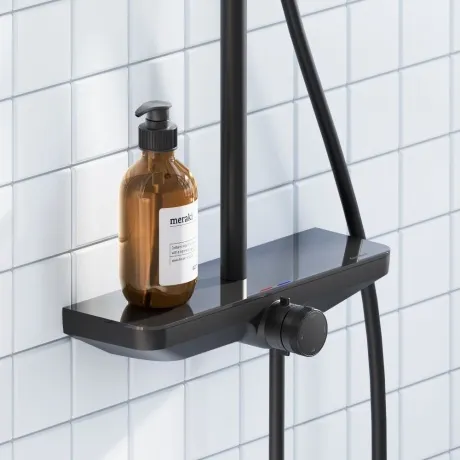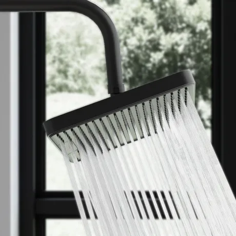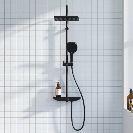 Чистые геометричные линии душевой системы Merkur в сочетании с черным матовым покрытием идеально впишутся в интерьер современной ванной комнаты в скандинавском стиле. Несмотря на минималистичный дизайн, душевые системы этой серии отличаются широким функционалом и необычайной эргономичностью. Продуманные детали: корпус смесителя выполнен в виде удобной полочки из закаленного стекла, на которой можно разместить необходимые под рукой вещи. Невидимый излив совмещает в себе эстетику и удобство. Простое и интуитивное управление: регулируйте температуру воды и переключайте потоки между изливом, ручной и верхней лейкой плавным поворотом двухуровневой ручки. Настоящее SPA прямо у вас дома: увеличенный размер тропической лейки с регулируемым углом наклона (220 мм) и 3 режима ручного душа сделают ваши ежедневные ритуалы незабываемыми. Благодаря телескопической штанге с диапазоном регулировки в 400 мм водные процедуры будут одинаково комфортны абсолютно для всех членов семьи. Специальное PVD-покрытие гарантирует чрезвычайную прочность душевой системы. Матово-черная поверхность не выцветает с годами и устойчива к механическим повреждениям, загрязнениям и отпечаткам пальцев.