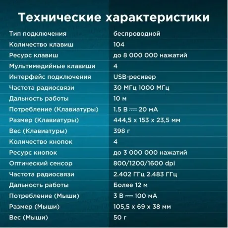 Беспроводная клавиатура с защитой от пролива воды, с регулируемыми по высоте ножками, с дополнительными мультимедийными клавишами и индикатором заряда батарей. Тип мыши оптическая. Количество кнопок мыши 3. Мультимедийные дополнительные клавиши