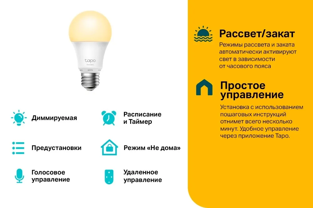 Умная лампа TP-Link Tapo L510E станет отличным выбором для любителей высокотехнологичных устройств. Управлять источником света можно с помощью мобильного приложения или голоса. Пользователю доступны масса настроек и функций – режим дня и ночи, изменение яркости, установка режима отсутствия и программирование по расписанию. Кроме того, реализована возможность управления лампой TP-Link голосовыми командами при использовании Яндекс Алисы, Mail.ru Маруси или Google Ассистента.